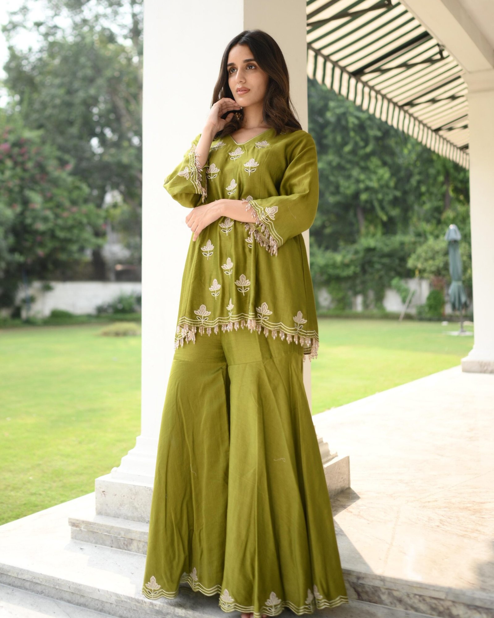 The Afreen Sharara Set from our Saanjh Collection is designed to make every celebration memorable. Crafted in silk chanderi with soft mal mal lining, it features delicate organza patchwork and is beautifully adorned with crystal hangings on the sleeves and kurta hem, adding a sparkling festive touch.