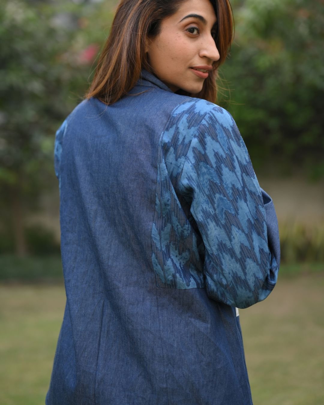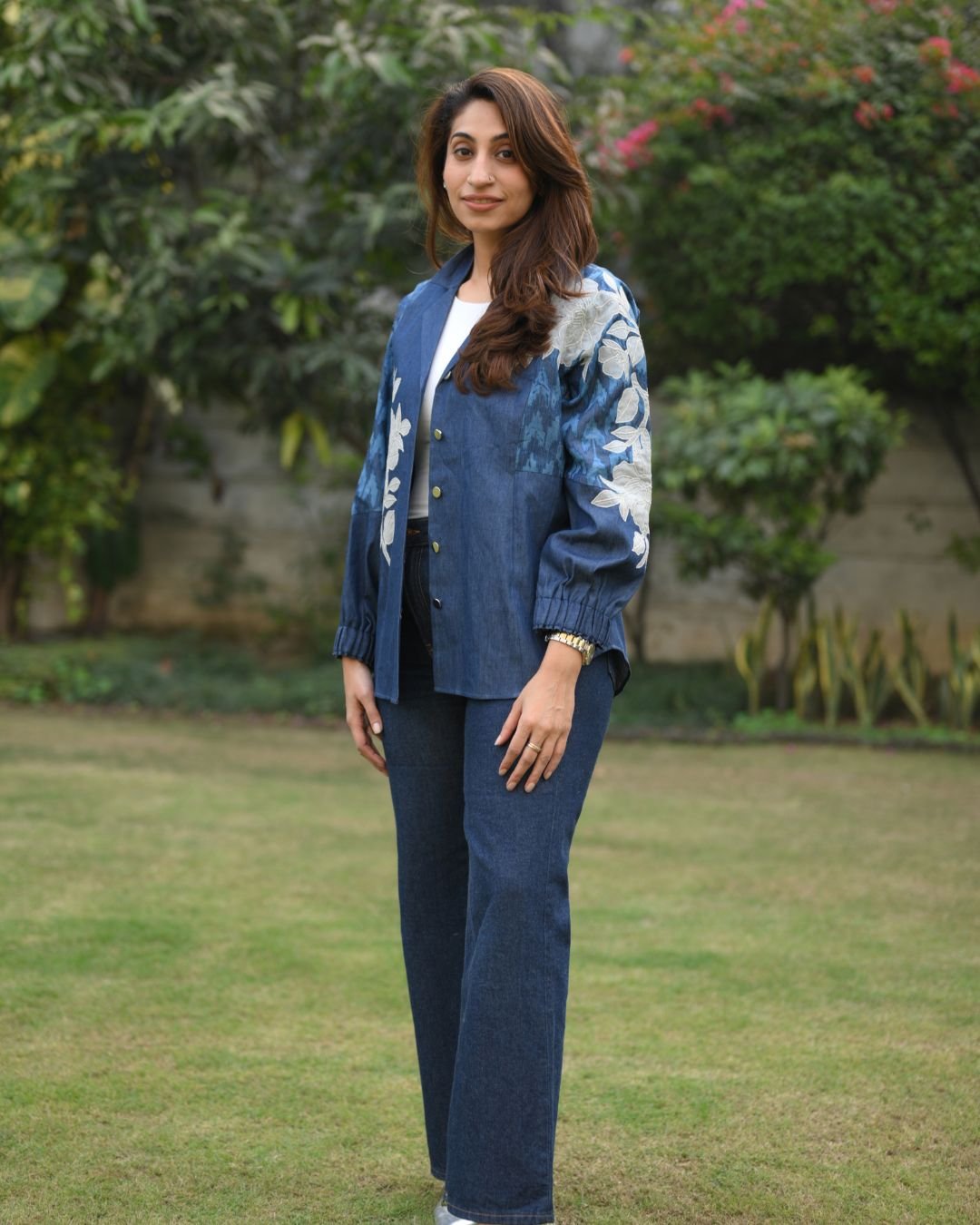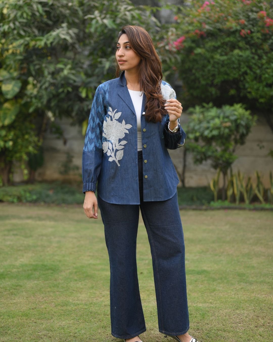 The Ashford Denim Shirt is crafted from premium denim, combining a classic silhouette with elegant designer detailing. The shirt features organza patching enriched with delicate silver dori work, adding a refined, artisanal finish to the timeless denim look. Versatile and stylish, it’s perfect for elevated casual wear and chic everyday styling.