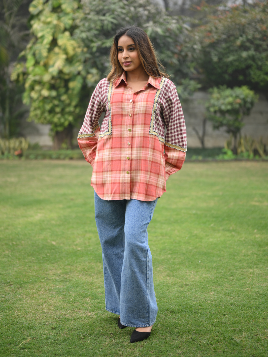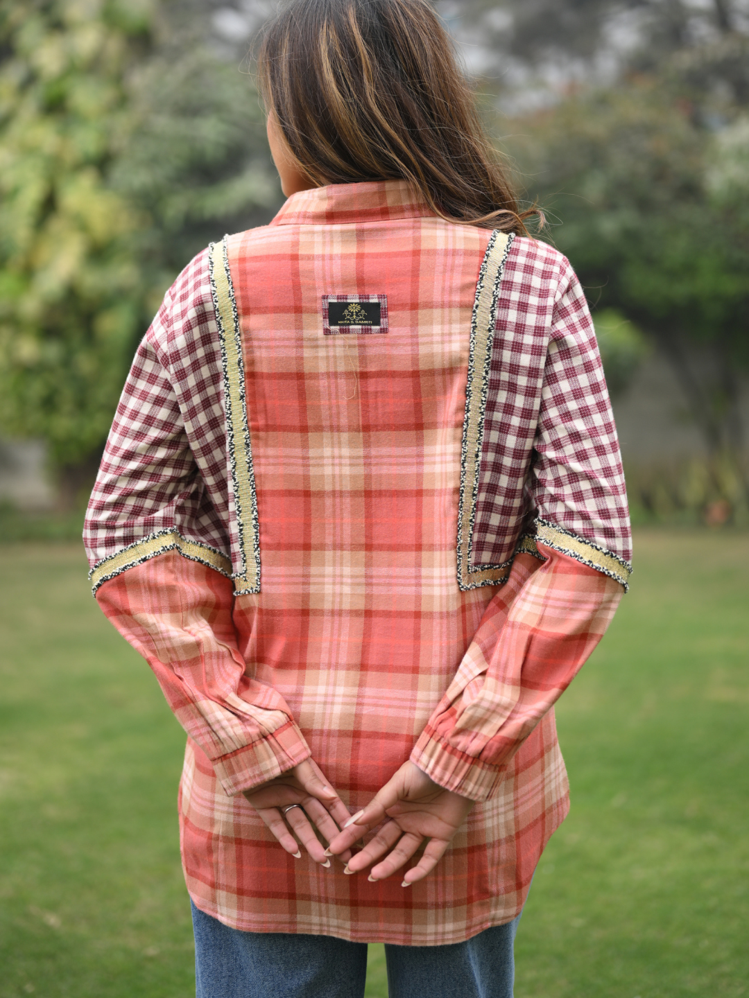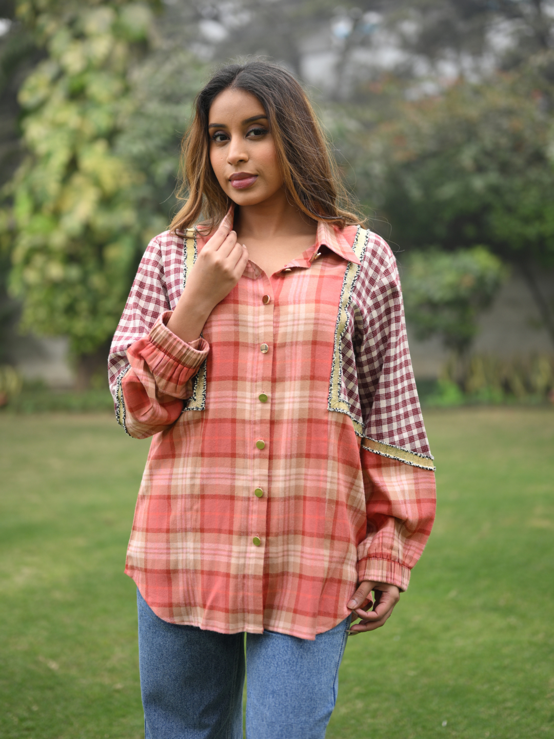 The Cheeky Tan Check Shirt from the Everyday with N&S Collection offers a perfect balance of comfort and contemporary style. Made from soft twill cotton, it features a distinctive tan check pattern complemented by metallic buttons and subtle golden lace detailing. Designed for everyday wear, this shirt effortlessly transitions from casual outings to smart-casual occasions.
