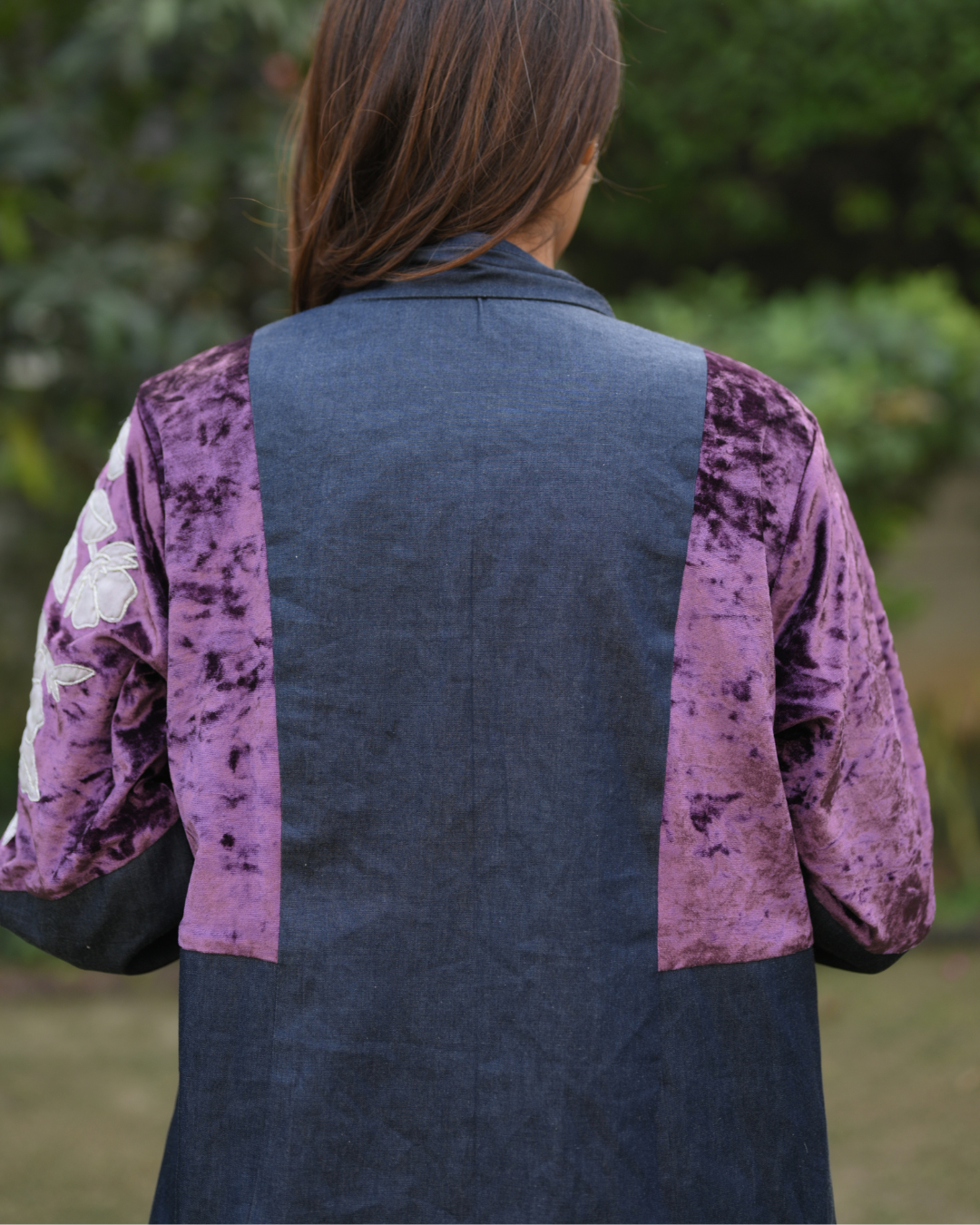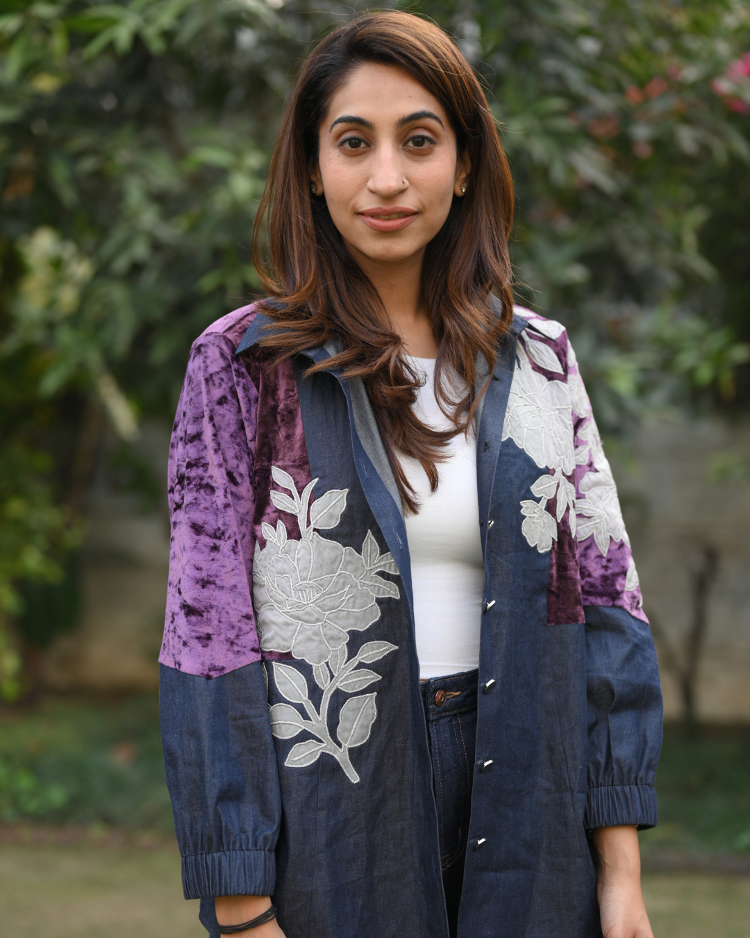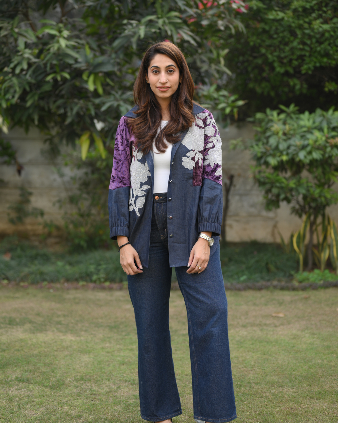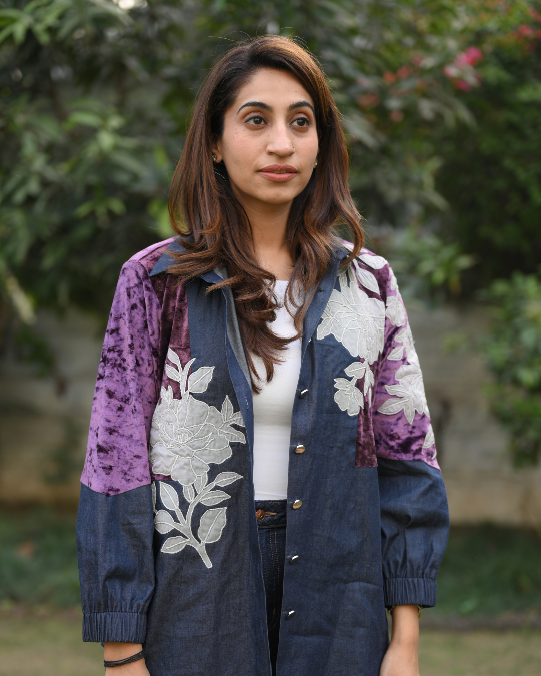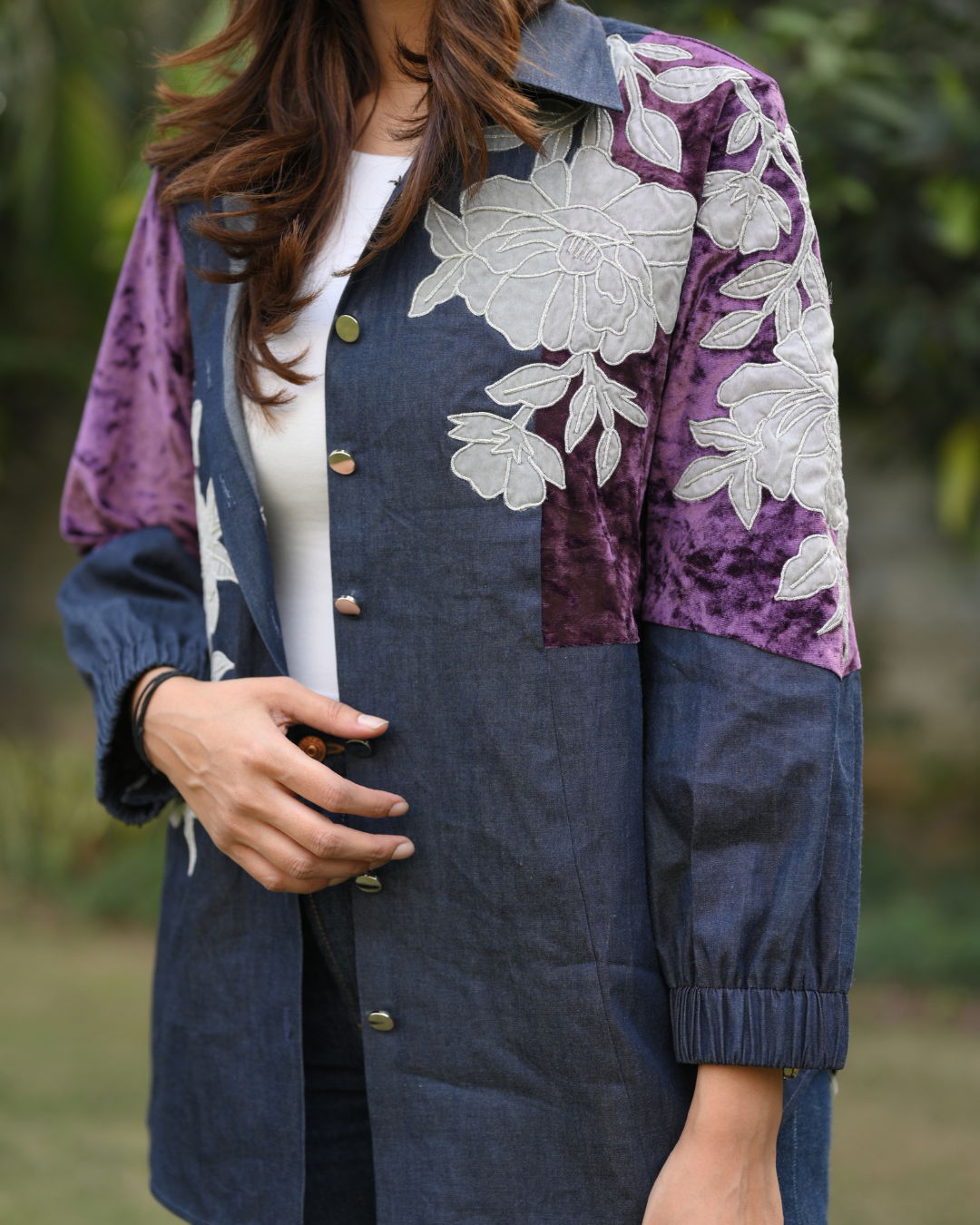 The Clarissa Denim Shirt is designed with a luxurious blend of silk velvet and denim, creating a rich contrast of texture and style. The shirt is elevated with organza patching, delicately finished with silver dori work for a refined, artisanal touch. Modern yet elegant, it makes a statement with its unique fabric combination and intricate detailing—perfect for elevated casual or chic daywear.