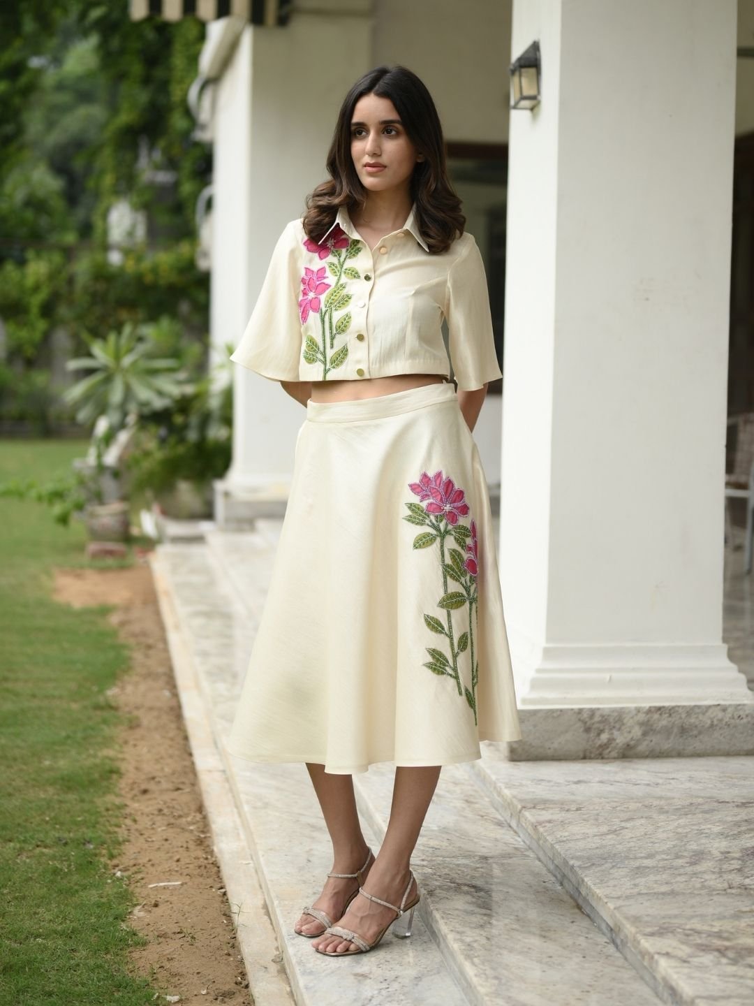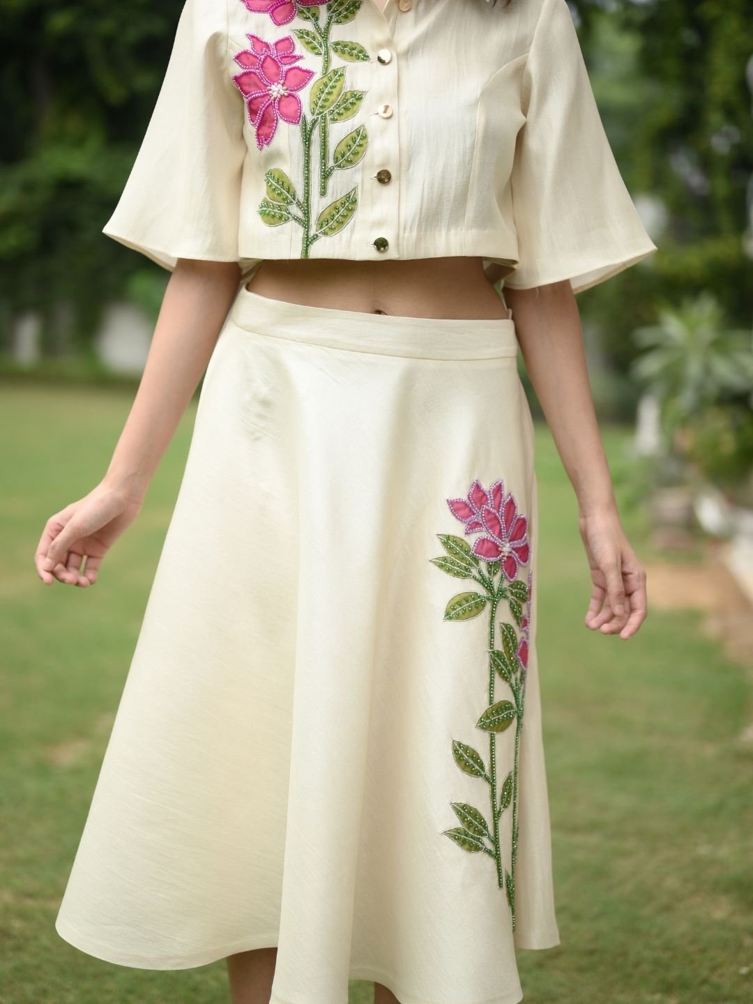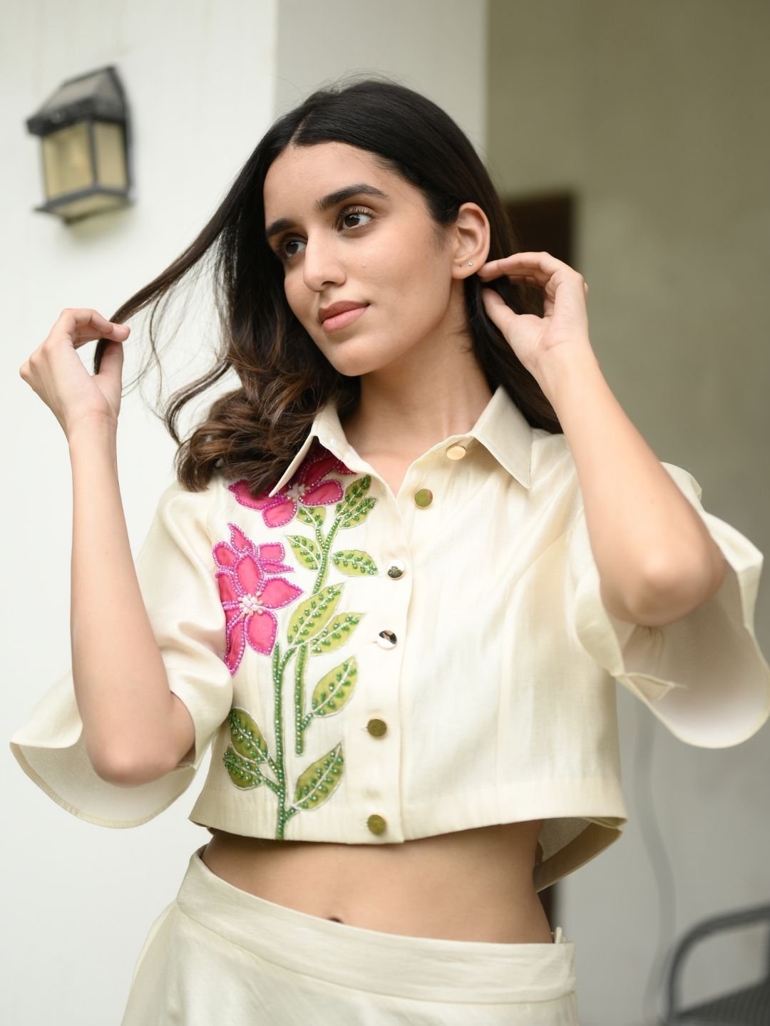 The Crystalline Crop Top & Skirt is a statement ensemble that blends modern silhouettes with traditional craftsmanship. Made from luxurious Banarasi linen, it showcases elegant silver dori work complemented by appliqué accents and crystal handwork. With a chic 15-inch crop top paired with a flowing skirt, this set is perfect for festive celebrations and special occasions.