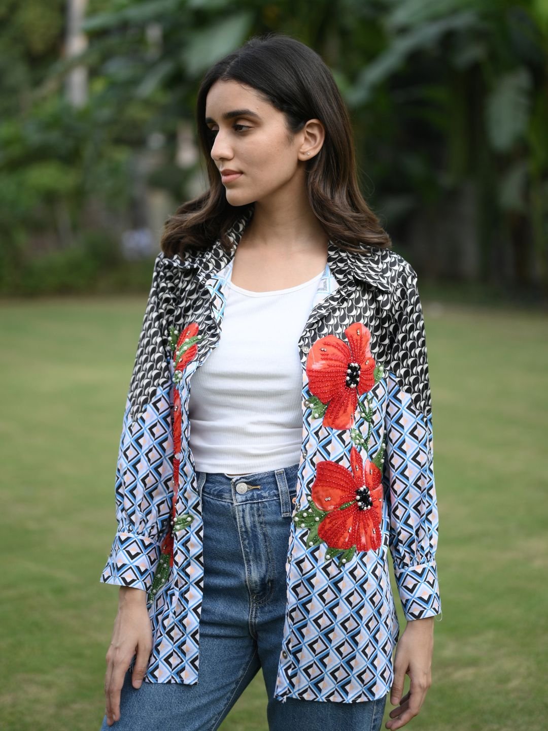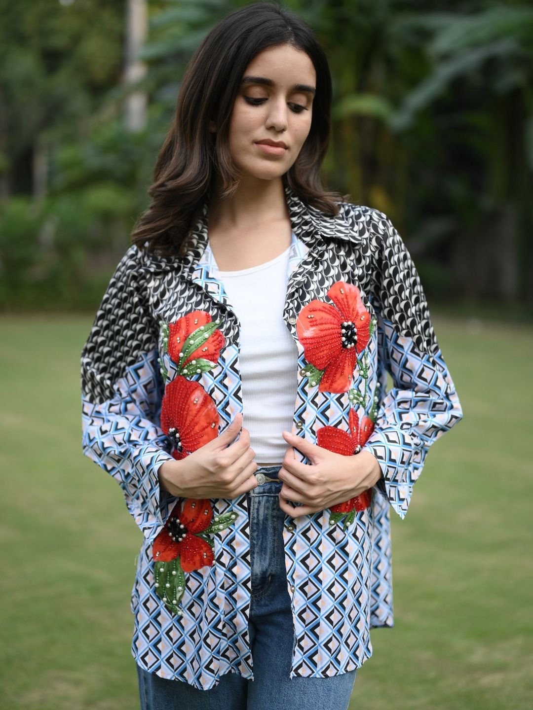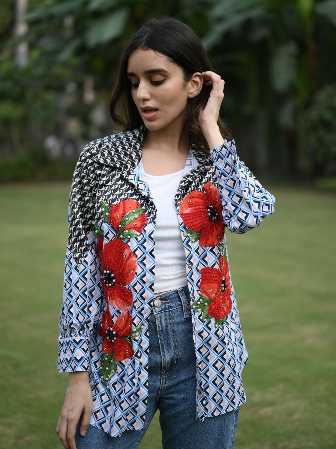 The Cycadelic Shirt is designed for those who love expressive style with a refined edge. Made from a luxurious blend of mercerised cotton and satin, it showcases bold cycadelic-inspired appliqué work highlighted with pearl and crystal bead handwork. Ideal for casual outings and standout everyday looks, this shirt brings creativity and elegance together effortlessly.