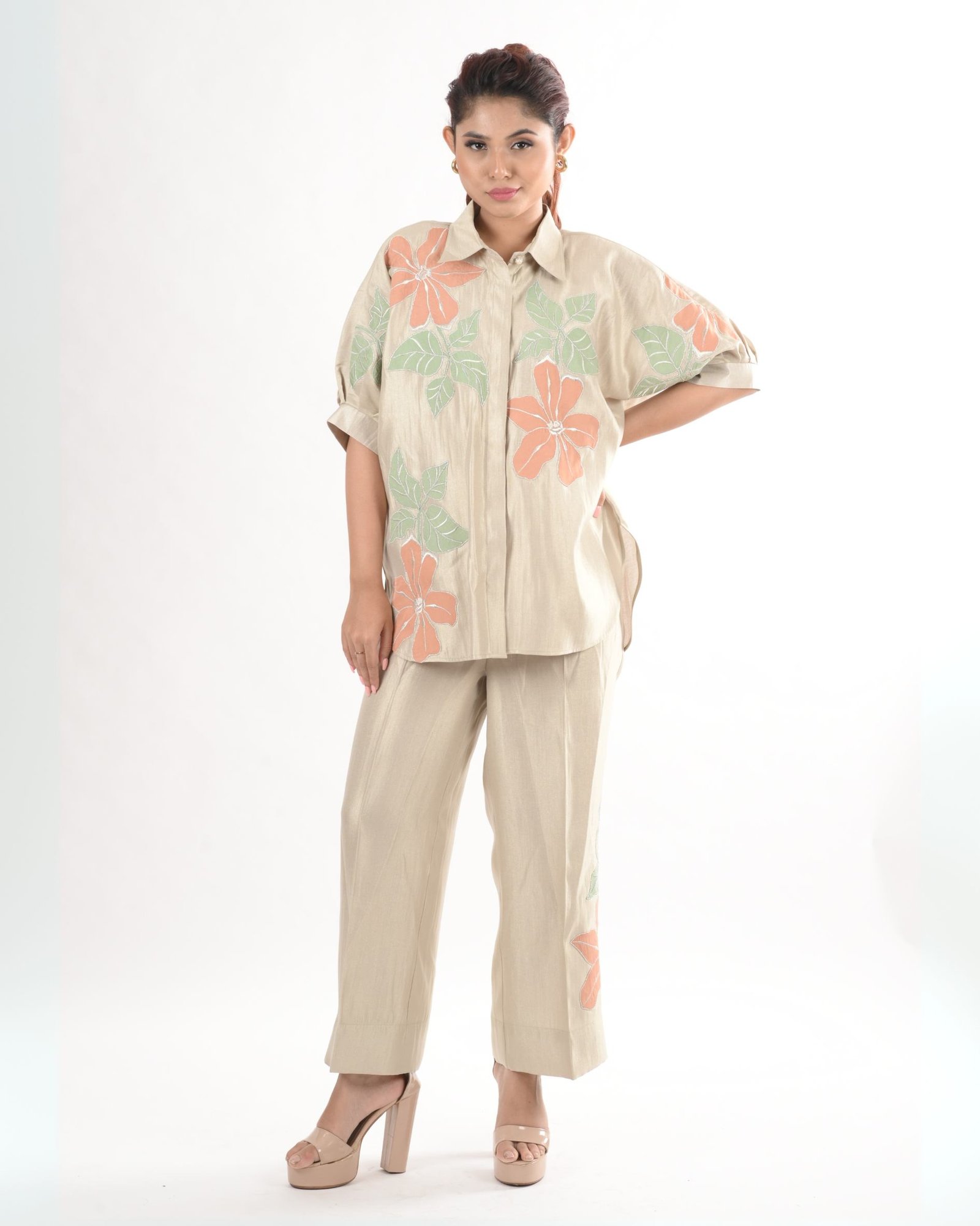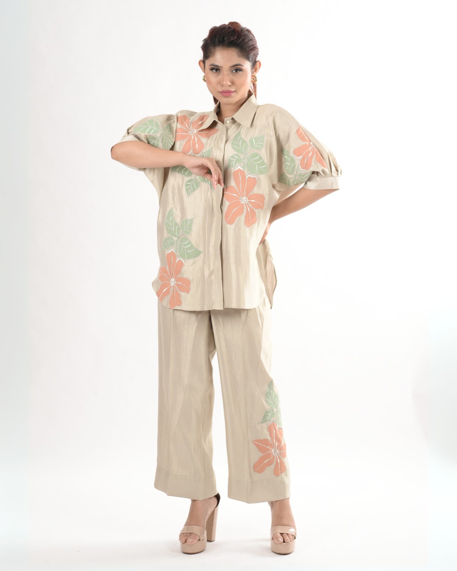 Step into effortless elegance with this Floral Beige Cord Set, designed for both comfort and style. Crafted from breathable fabric, this set features a relaxed-fit shirt and matching trousers adorned with soft floral prints in pastel tones. Perfect for casual outings, vacations, or brunch dates, this outfit blends sophistication with everyday wearability
