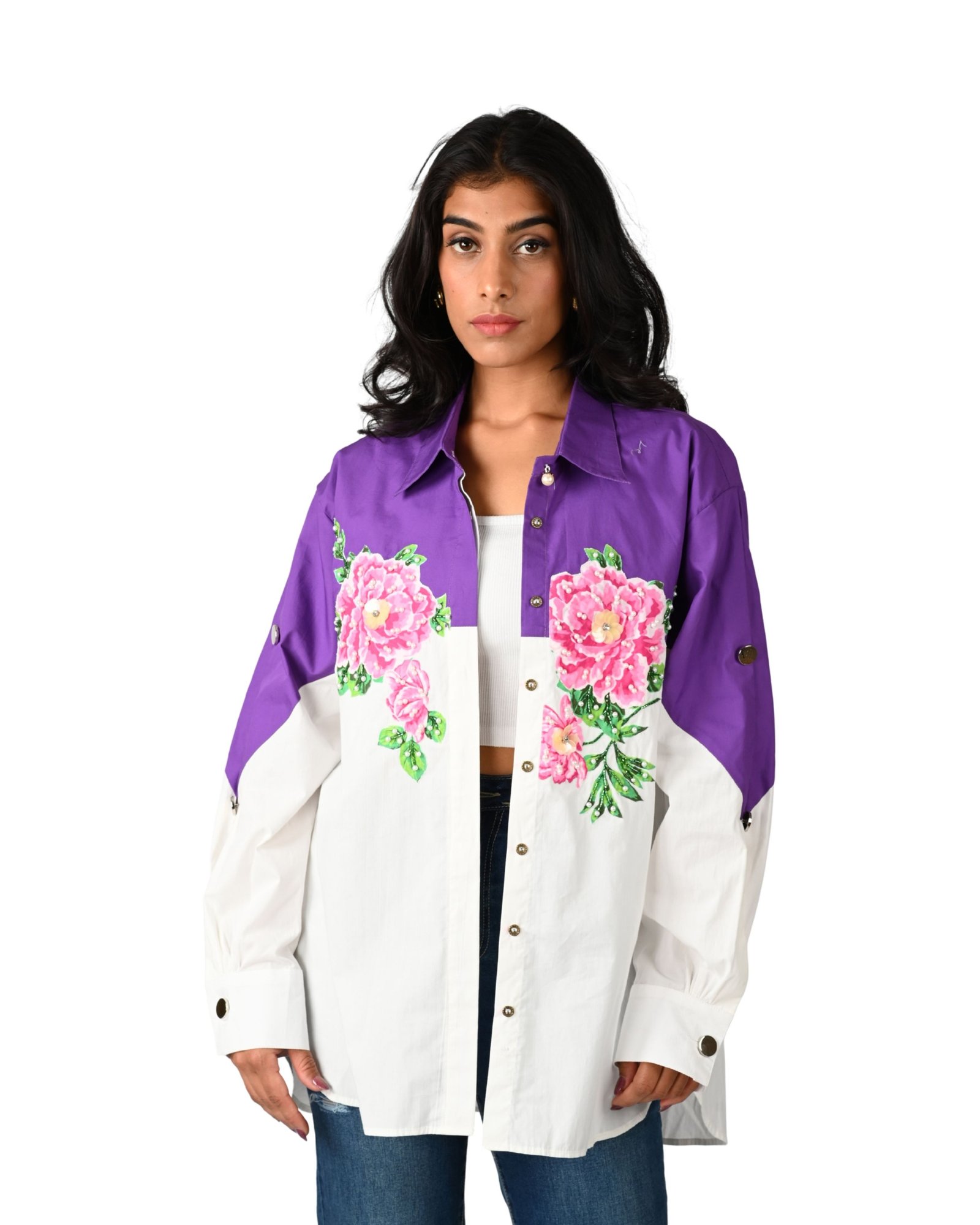 Stay stylish and comfortable with this oversized floral embroidered shirt. Designed with bold contrast colors and delicate pink floral embroidery, it’s a versatile piece you can wear buttoned up as a shirt or open as a light jacket.
