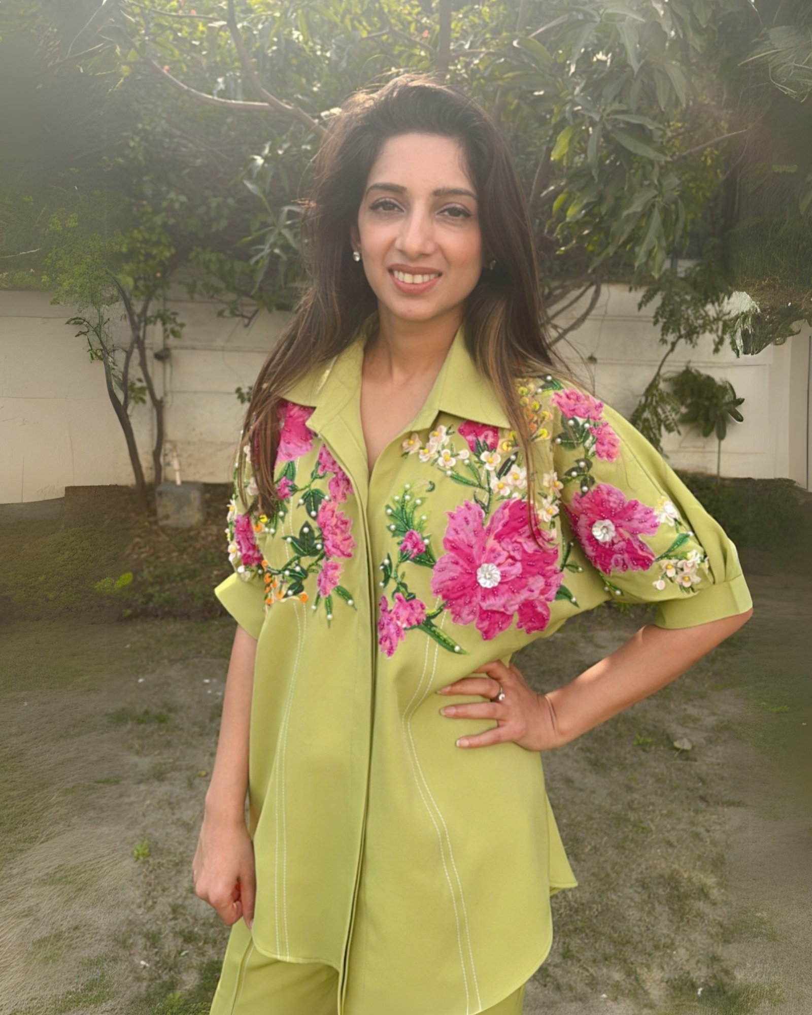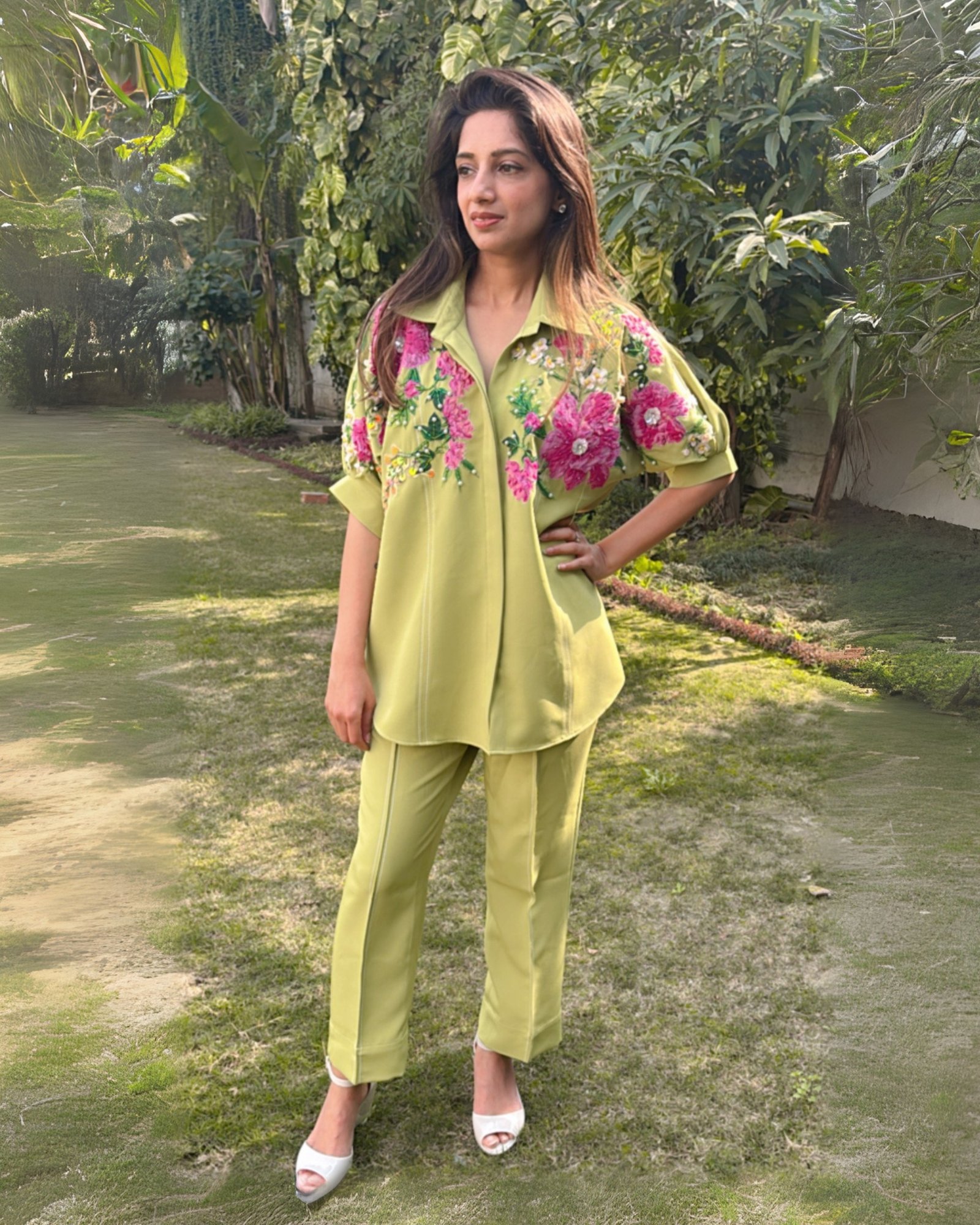 This breezy co-ord set features a refreshing green tone adorned with intricate bougainvilla floral embroidery for a touch of elegance. The soft, relaxed fit is perfect for all-day wear, while the tailored pants add a sleek and polished vibe. Ideal for brunches, garden parties, or casual outings, it brings a perfect blend of color, charm, and comfort.