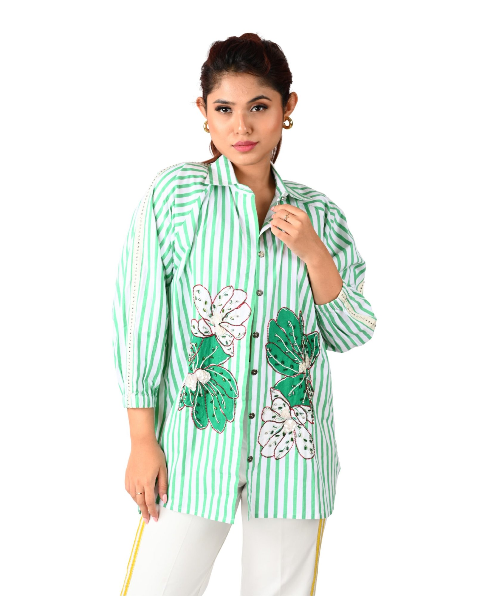Bring freshness to your style with this elegant green striped long shirt, highlighted with bold floral embroidery at the hem. Its relaxed silhouette and chic detailing make it a versatile choice for casual outings, office wear, or layering over basics for a modern look