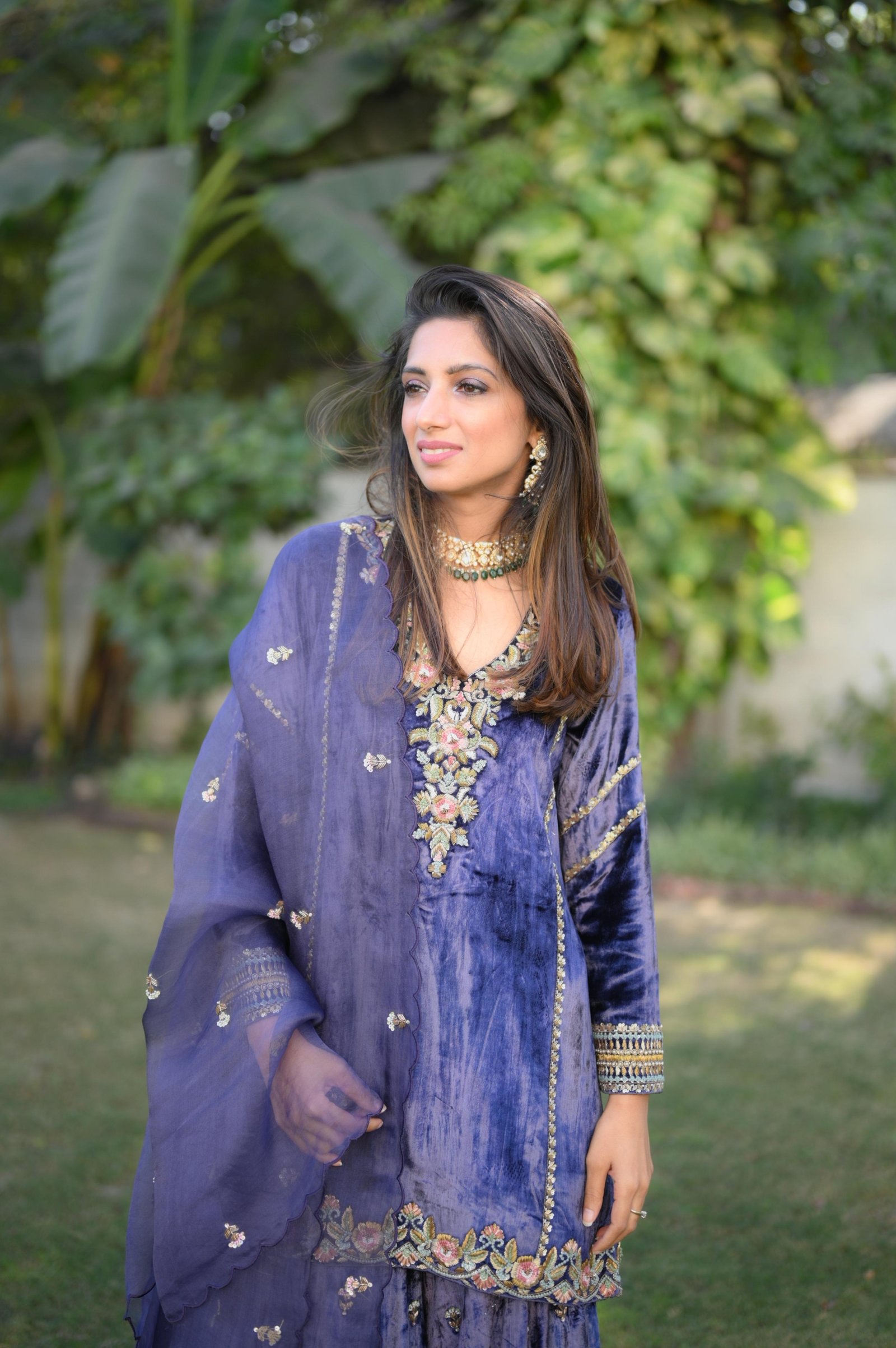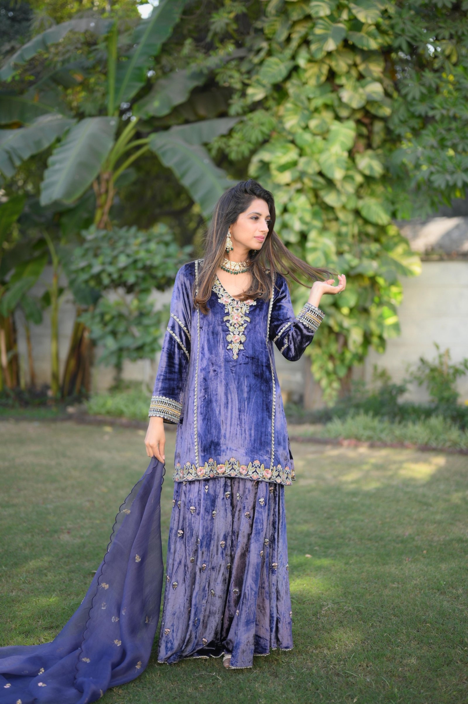 Gul-Posh is a celebration of traditional charm and luxurious design. Crafted in sumptuous velvet, this three-piece Sharara set features a beautifully detailed short hand-embroidered kurti paired with a flared and embroidered velvet sharara, exuding regal finesse.