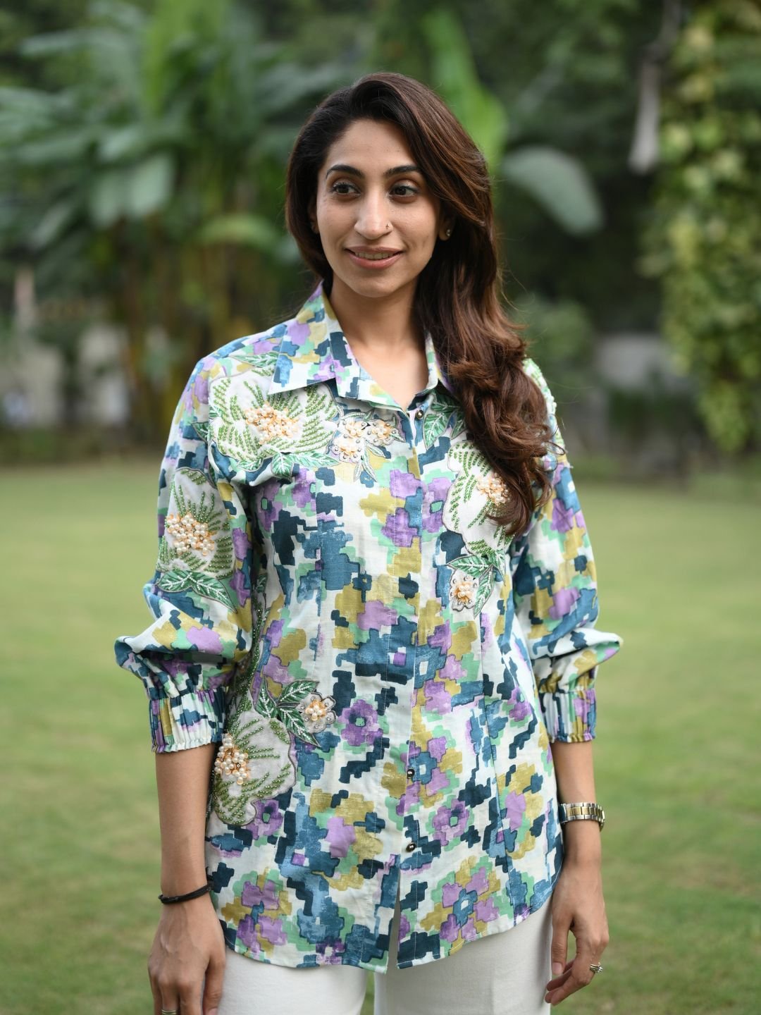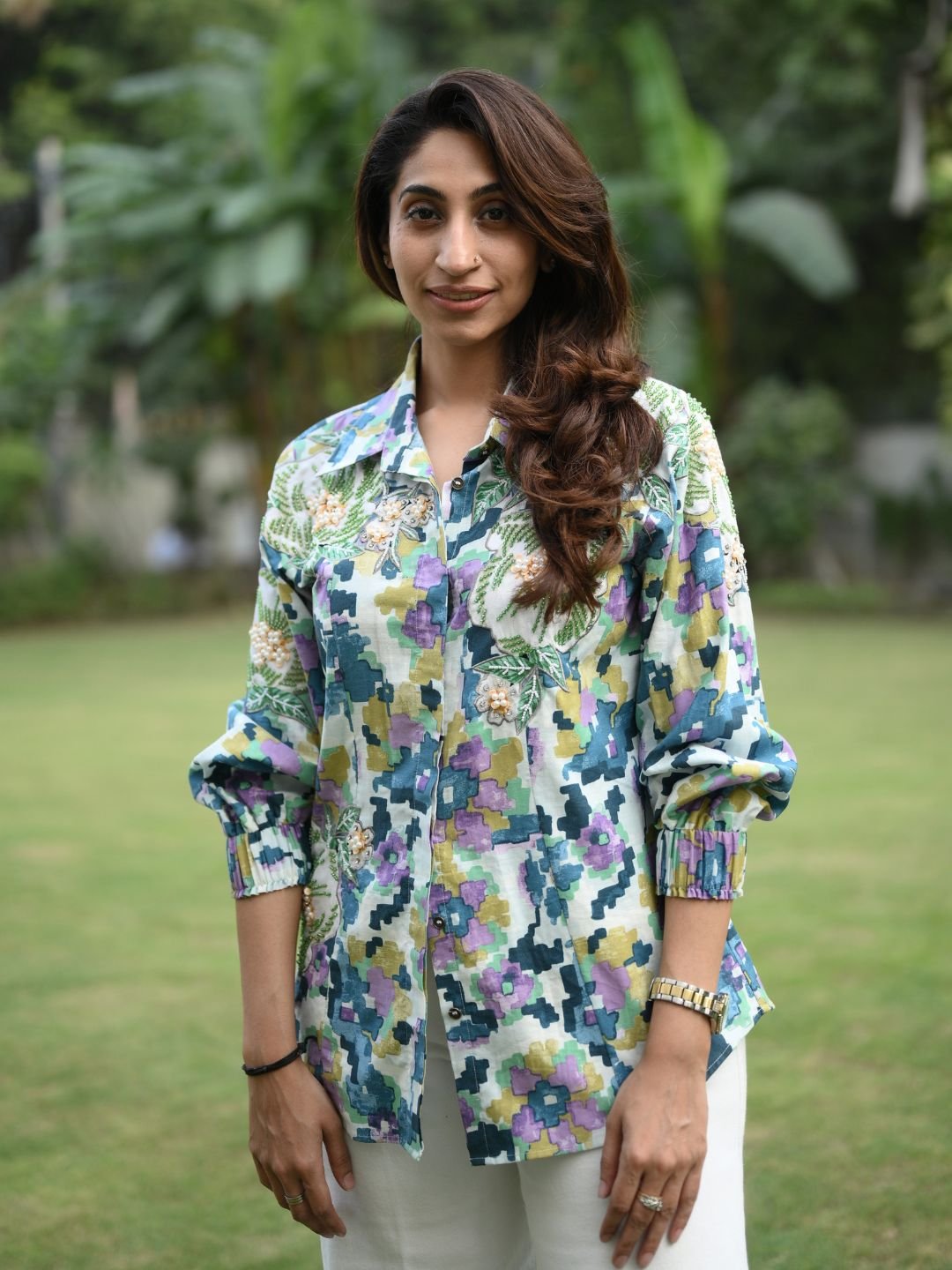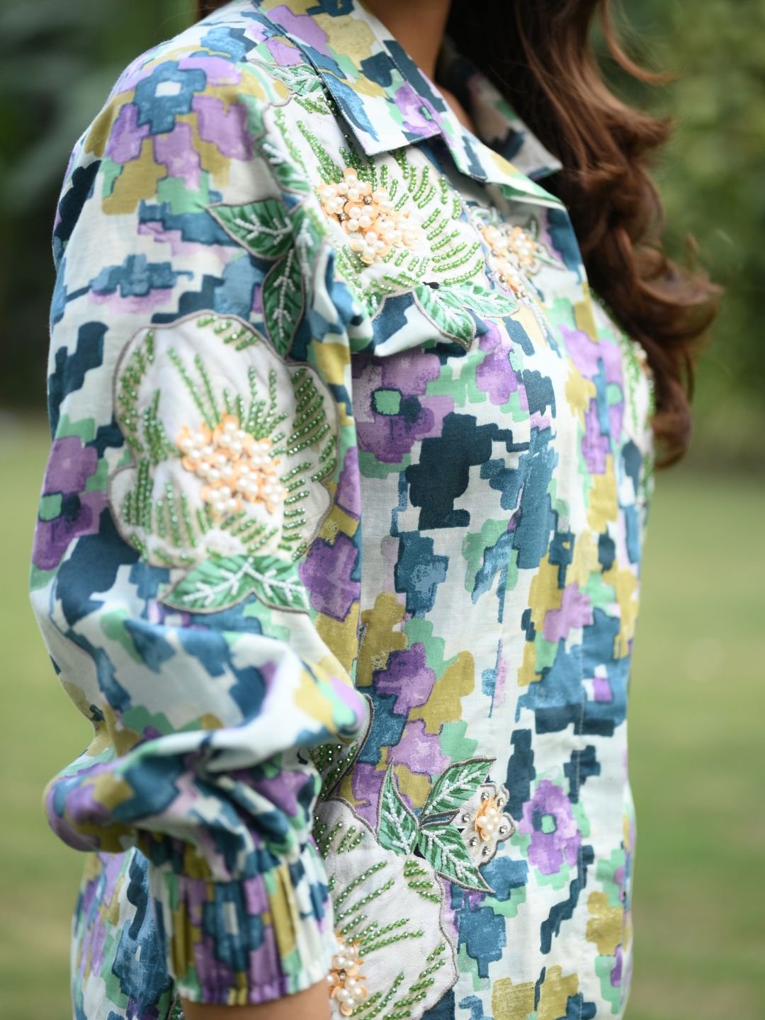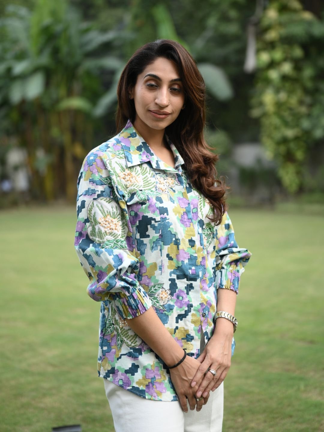 The Jigsaw Shirt blends contemporary design with everyday elegance. Made from premium mercerised cotton, it showcases distinctive jigsaw-inspired appliqué work enhanced with pearl and crystal bead handwork. Designed for effortless style, this shirt is ideal for casual wear and refined daytime looks.