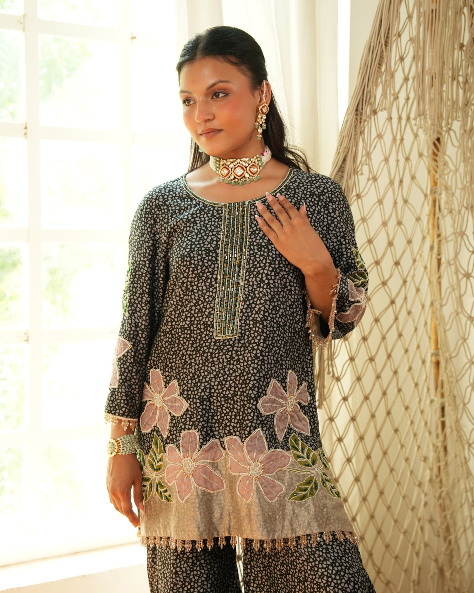 The Kundan Sharara Set from the NOURI Collection embodies refined elegance and timeless craftsmanship. Made from premium silk chanderi with a soft mal mal lining, it showcases intricate organza dori patchwork highlighted by pearls and crystal handwork. Paired with an embroidered sharara and matching dupatta, this ensemble is perfect for weddings, festivities, and special celebrations.