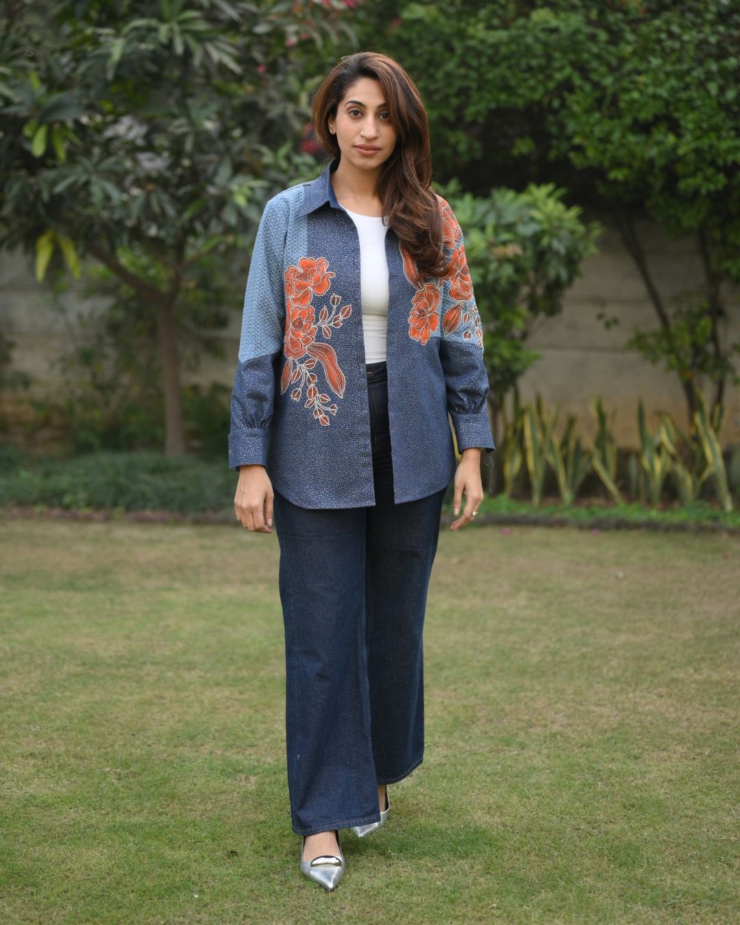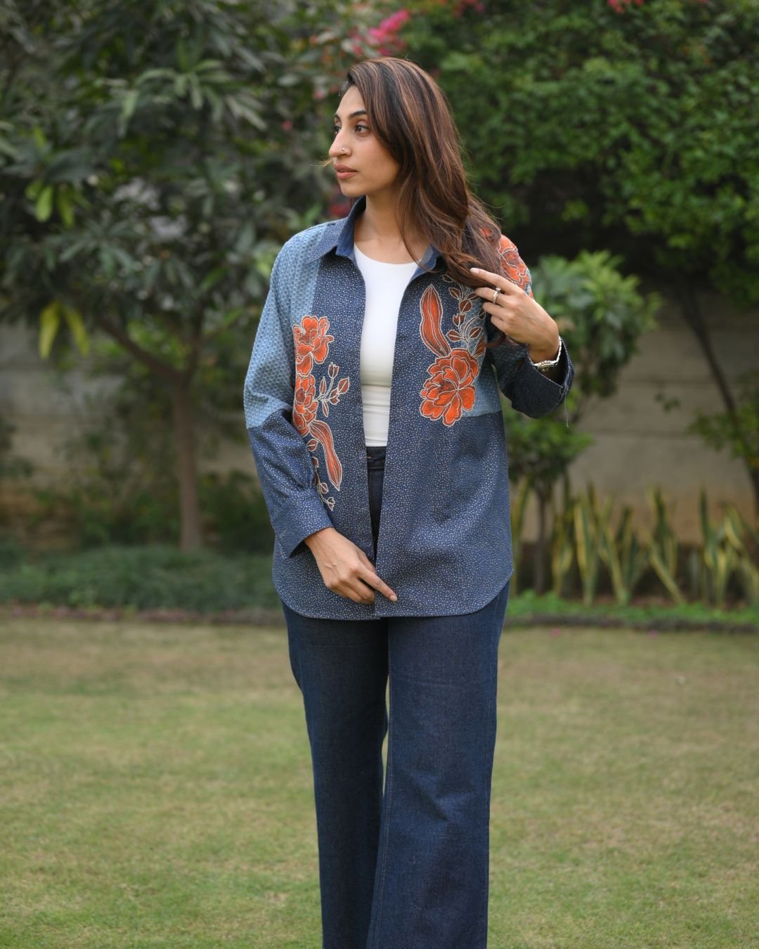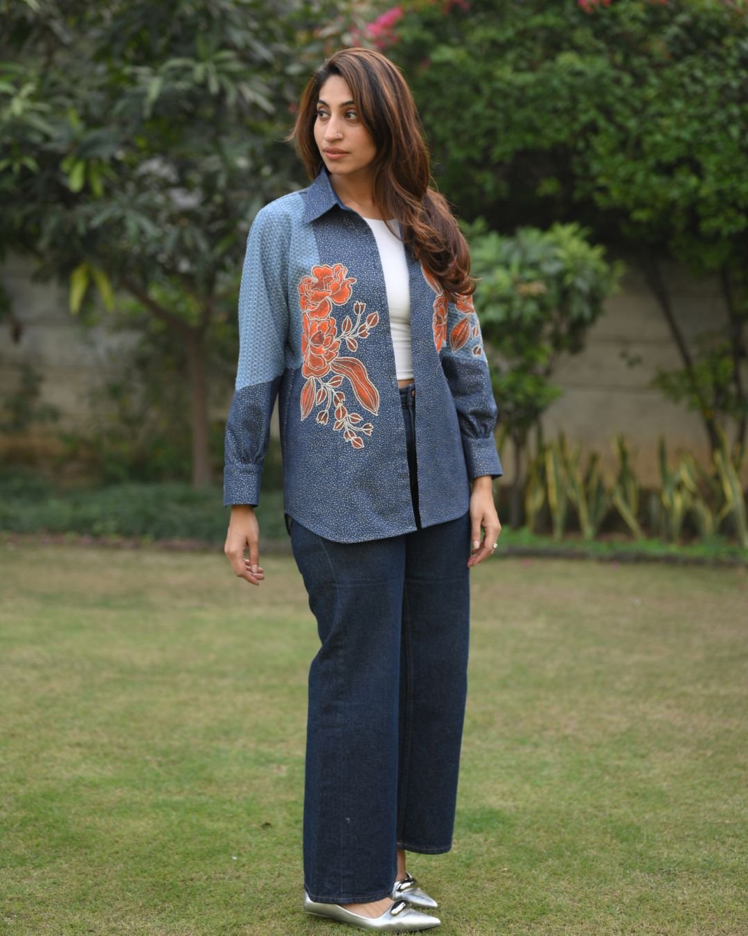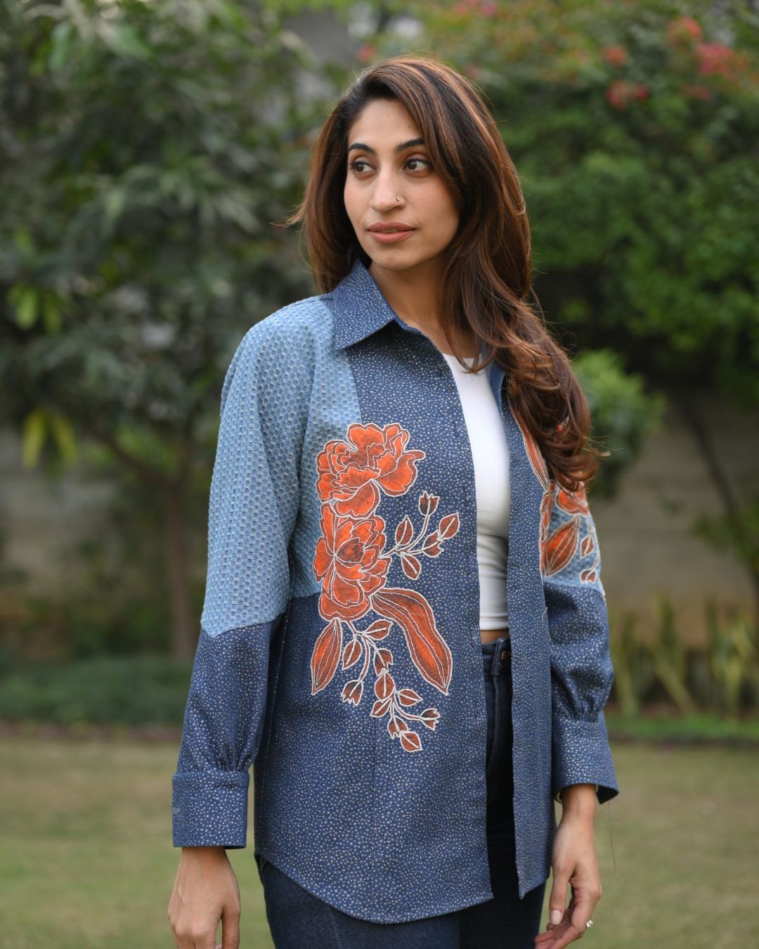 The Marigold Denim Shirt blends classic denim charm with elegant handcrafted detailing. Designed for effortless style, it features intricate applique work paired with refined dori detailing, creating a sophisticated yet contemporary look suitable for any occasion.
