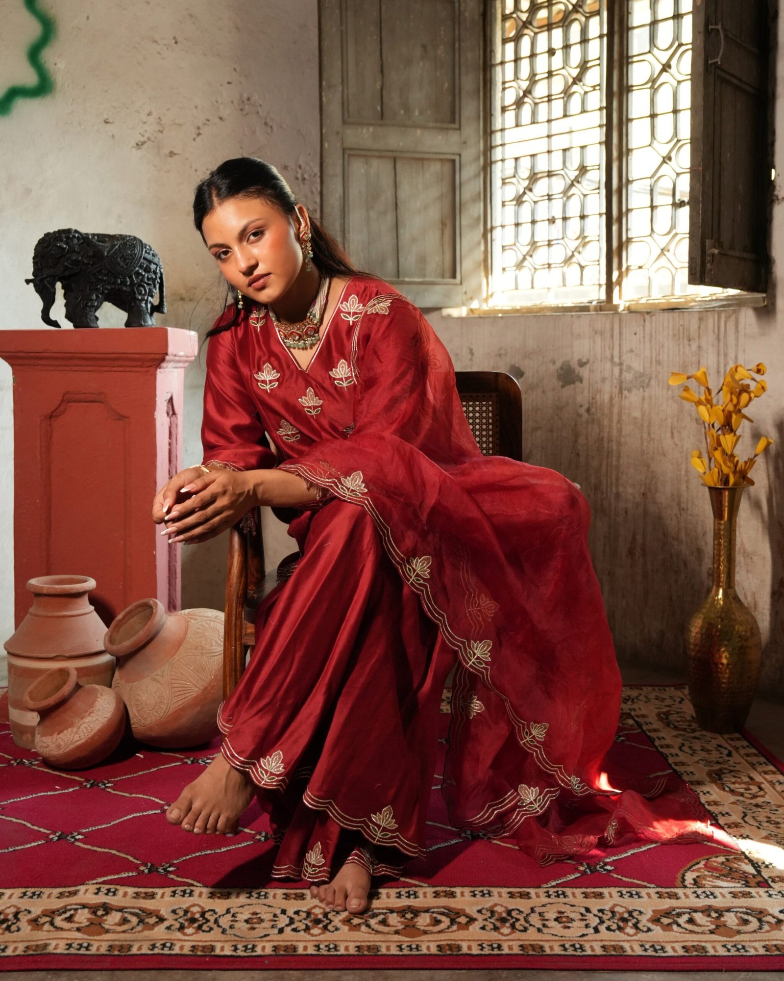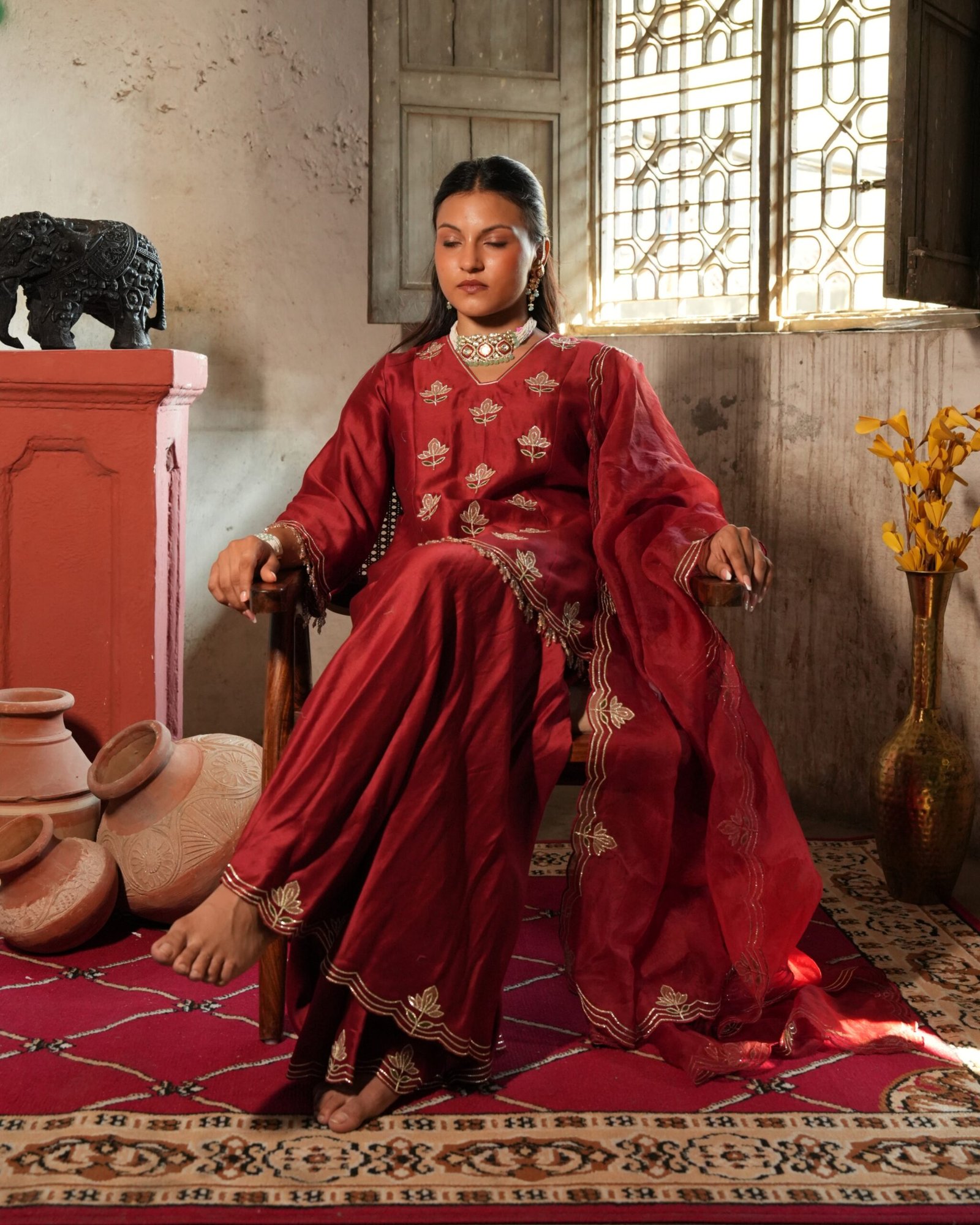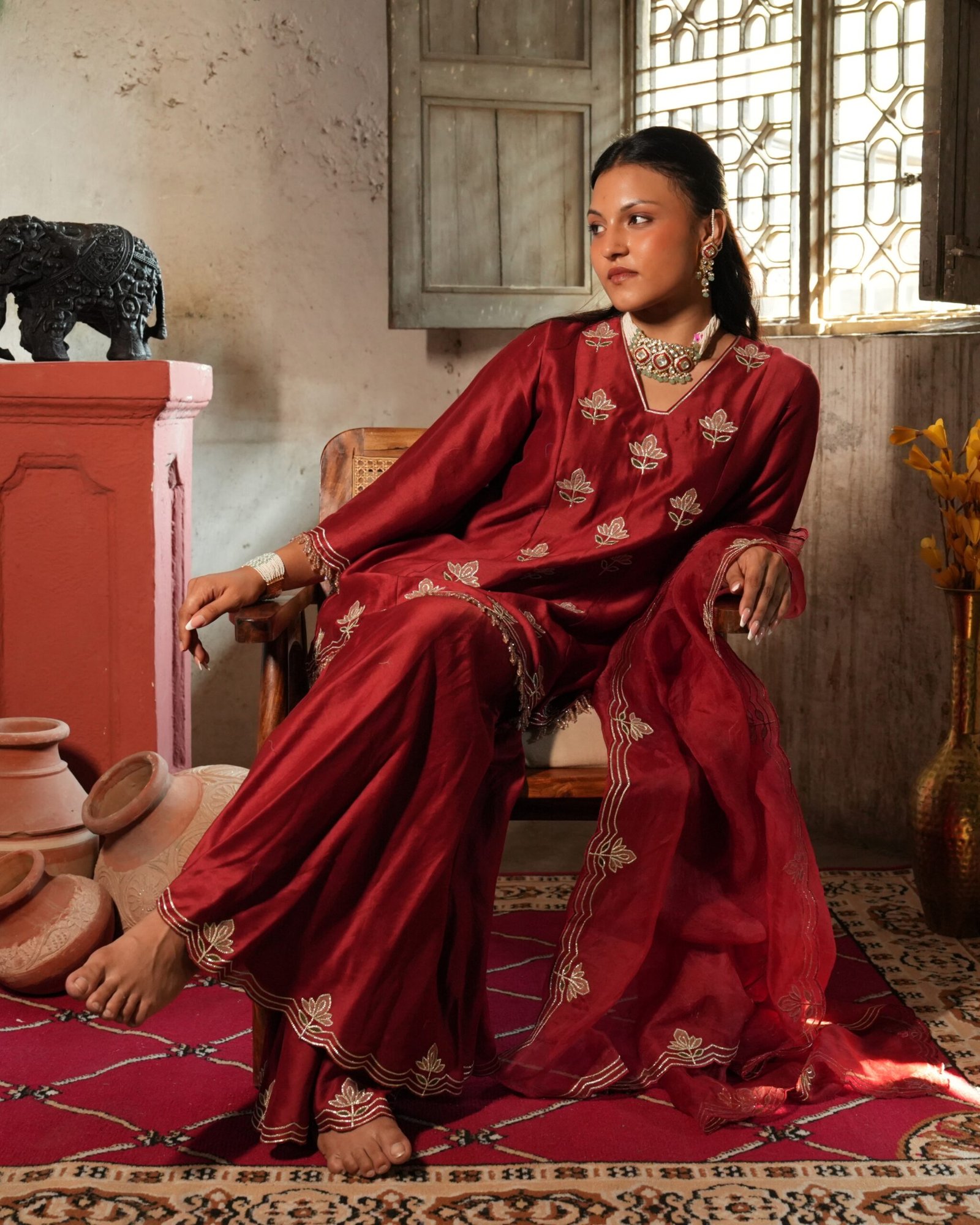 Step into elegance with the Mehtab Sharara Set from our Saanjh Collection. Crafted in rich silk chanderi with soft mal mal, it is enhanced with delicate organza patching and intricate cutwork detailing, perfect for festive and special occasions.