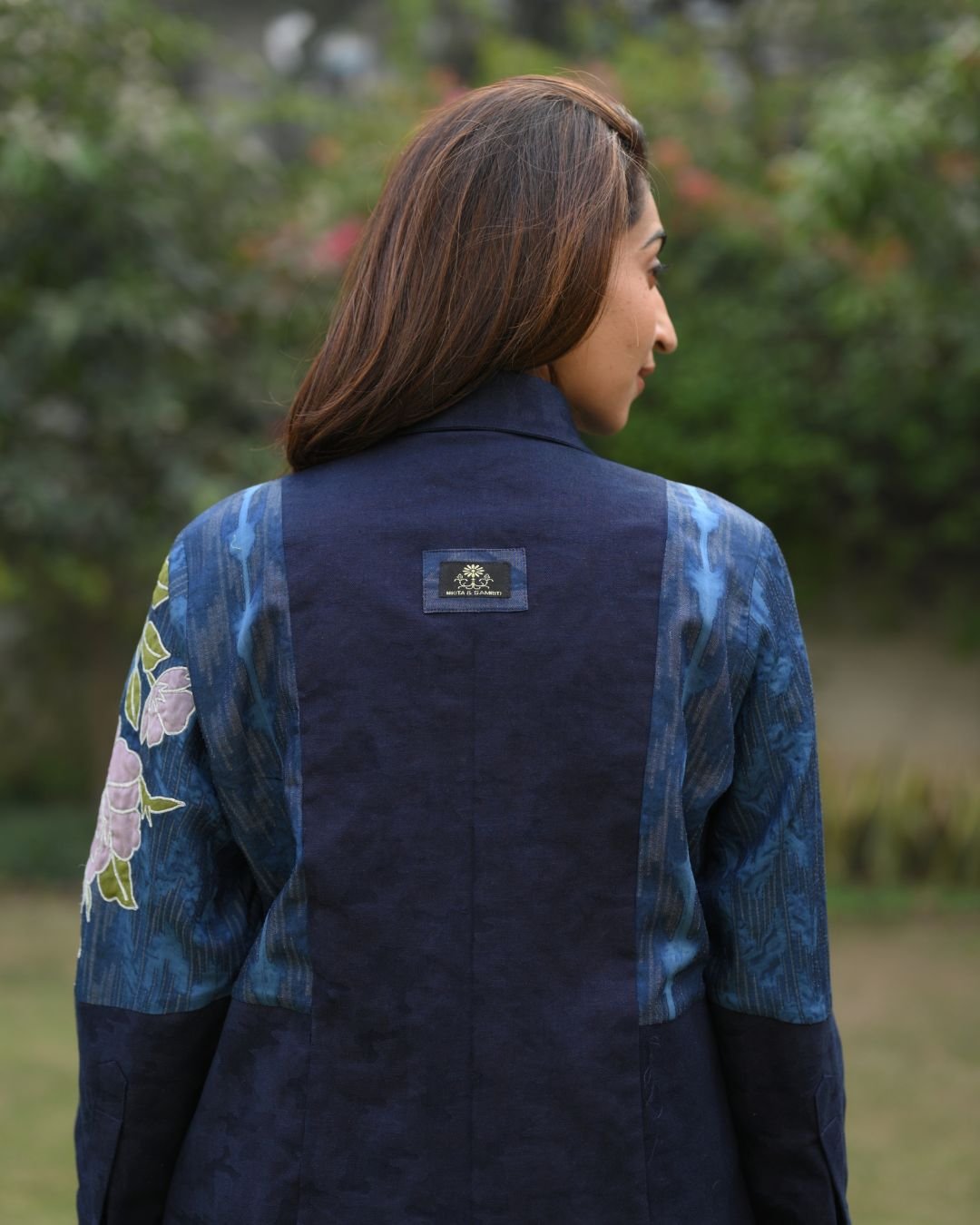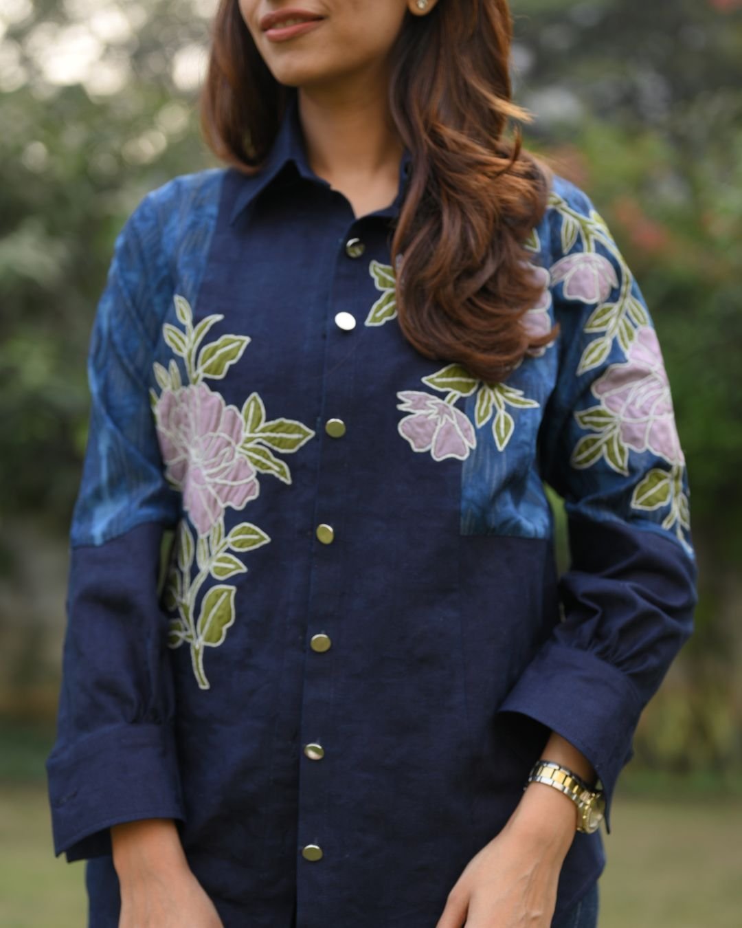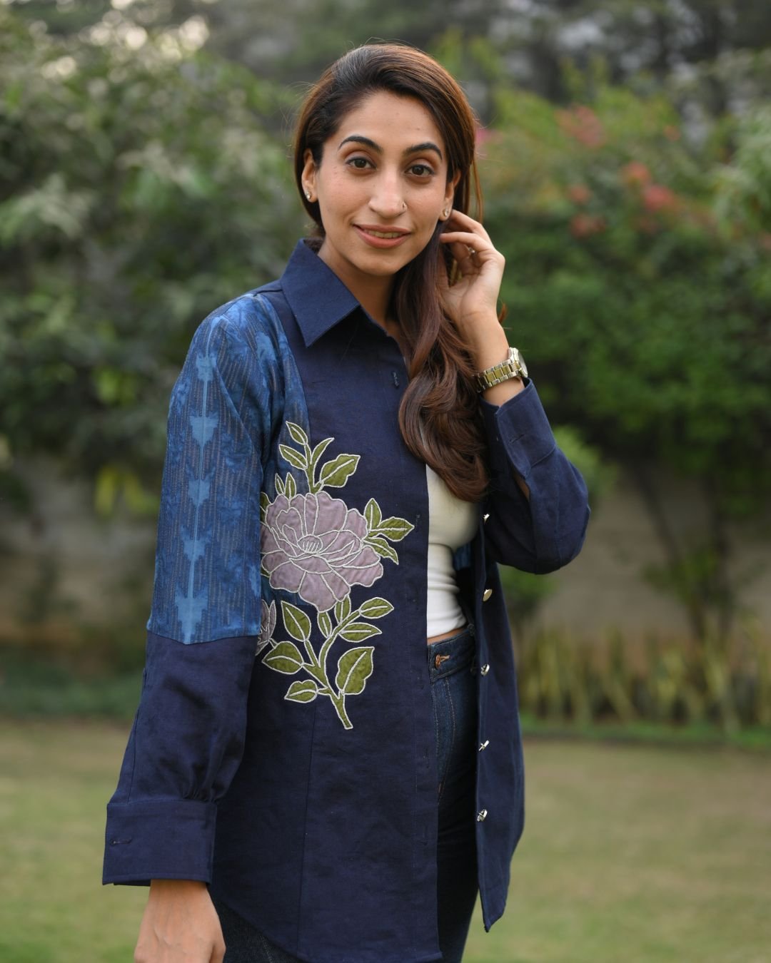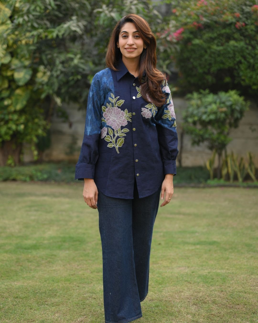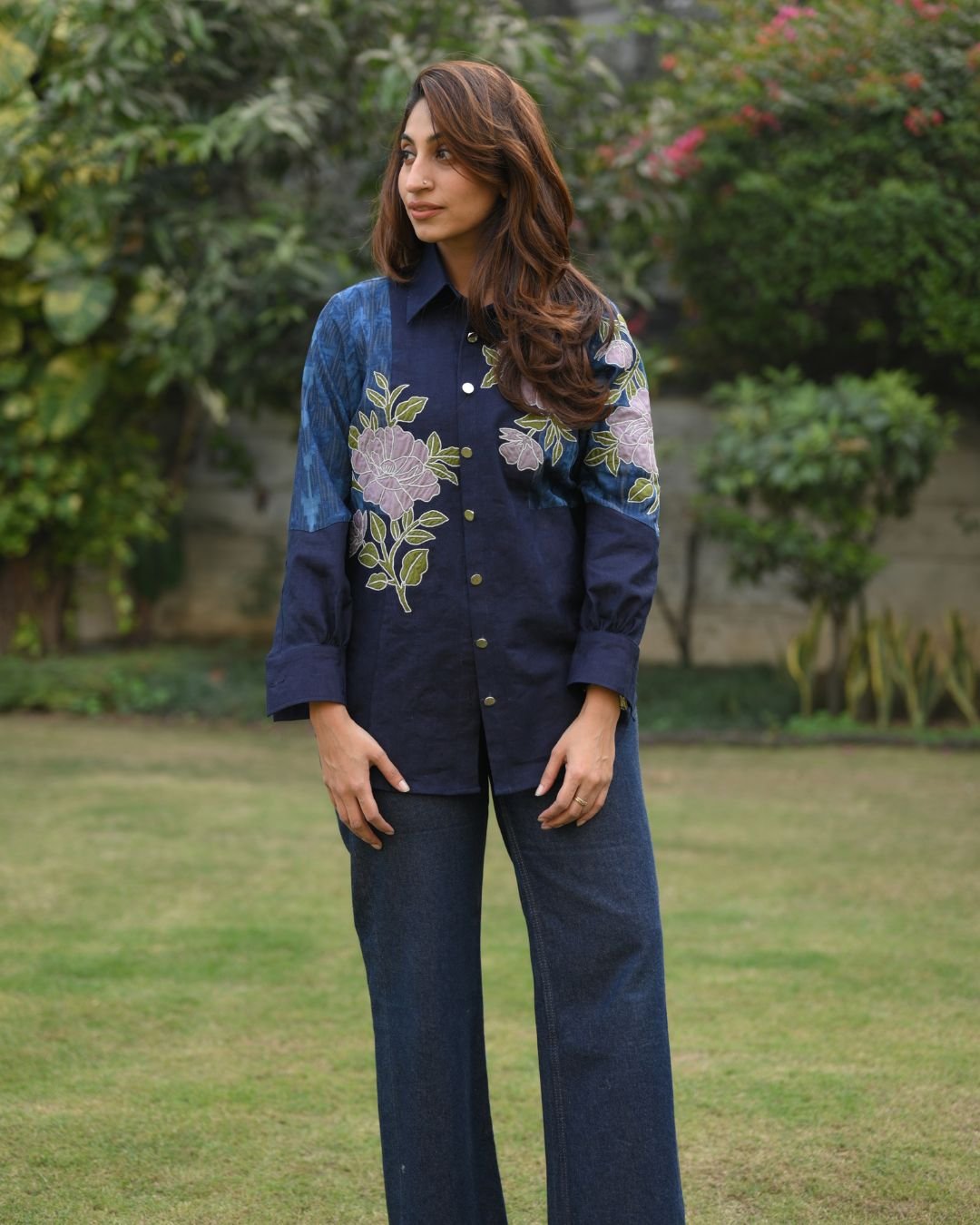 The Nerissa Denim Shirt is crafted from premium denim, offering a modern aesthetic with a touch of elegance. The design is elevated through organza patching, beautifully finished with delicate silver dori detailing. Contemporary yet refined, this shirt brings artisanal charm to a timeless denim silhouette, perfect for chic casual styling.