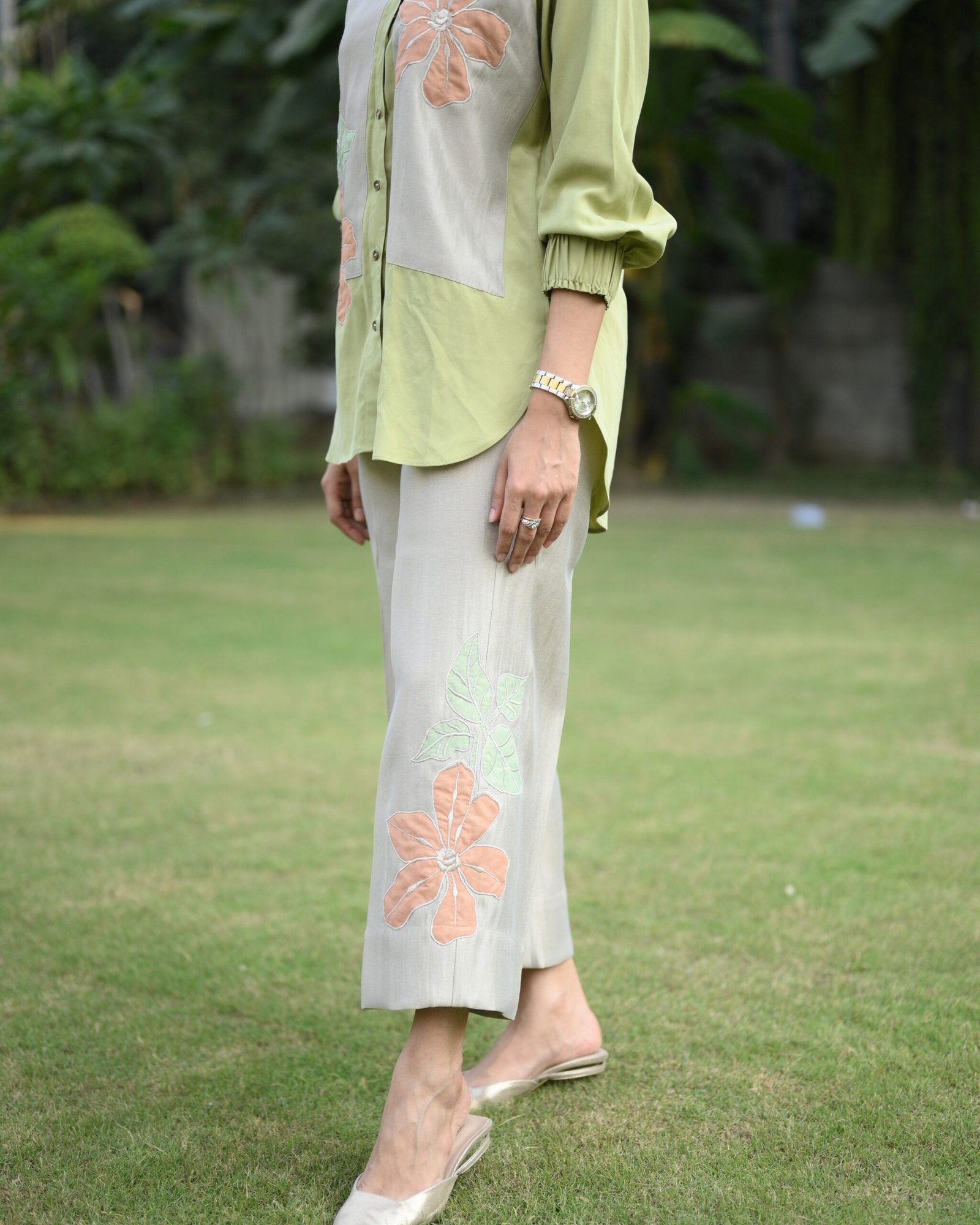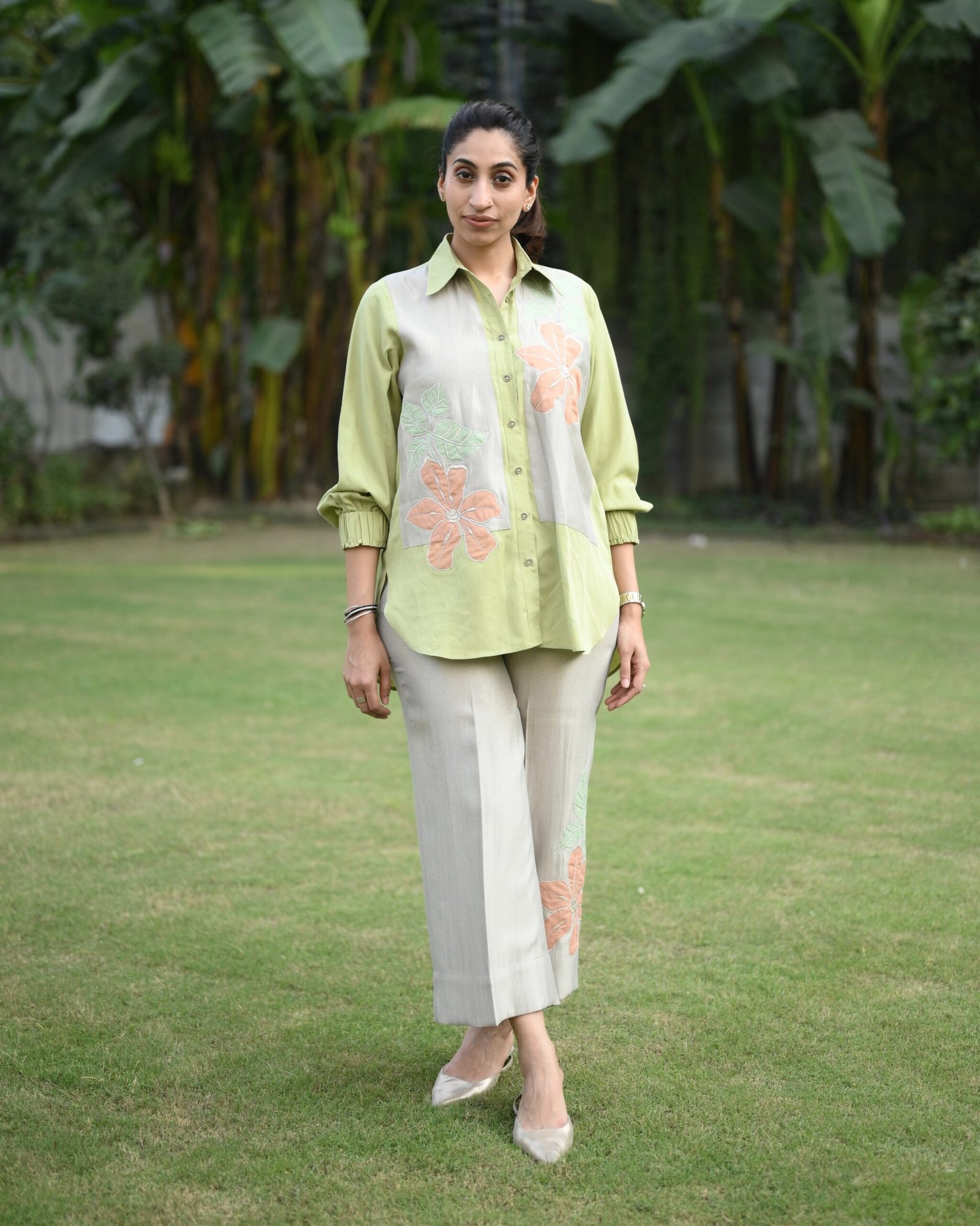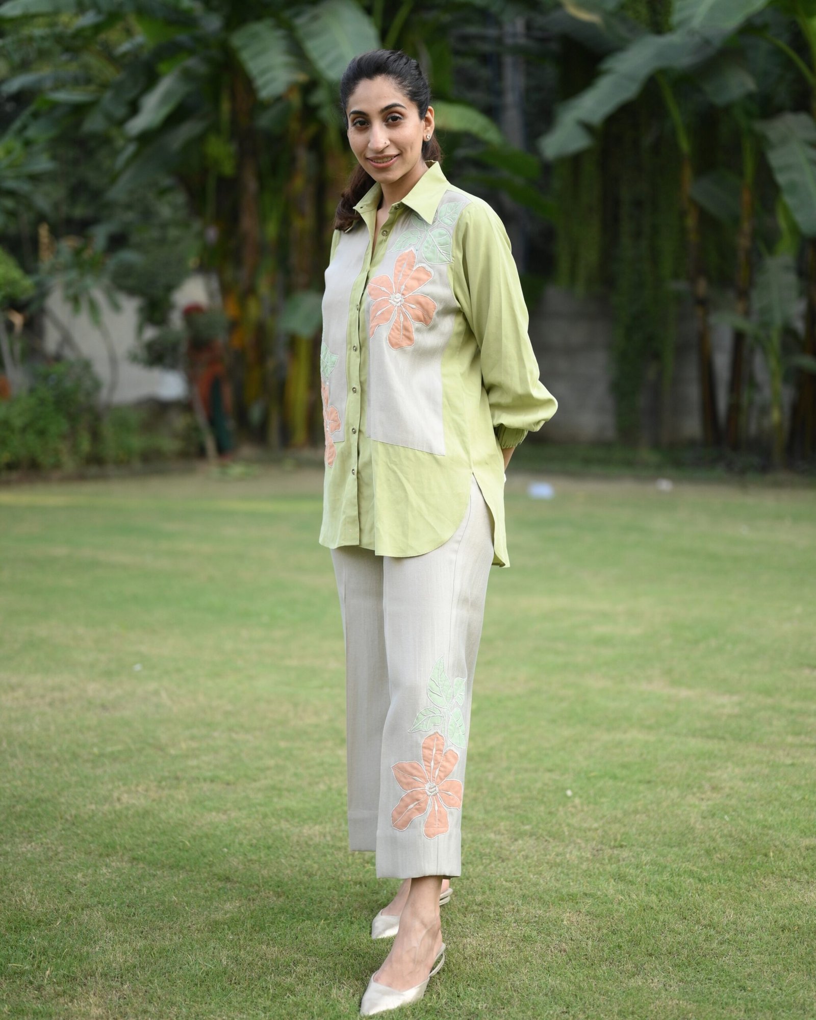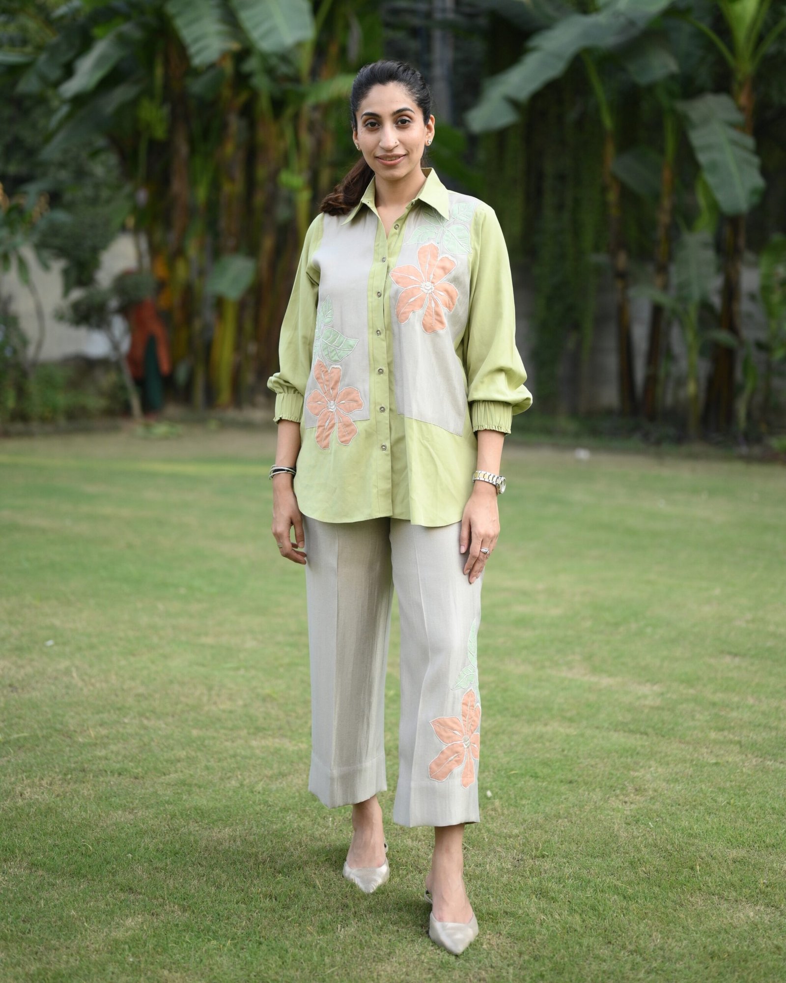 The Pansy Cord Set from our Collection Attire range is a perfect blend of sophistication and grace. Crafted with a tinsel linen top and Banarasi bottom, this ensemble exudes timeless elegance. The outfit is beautifully embellished with organza and dori patchwork, adding a touch of refined artistry that makes it ideal for festive and special occasions.