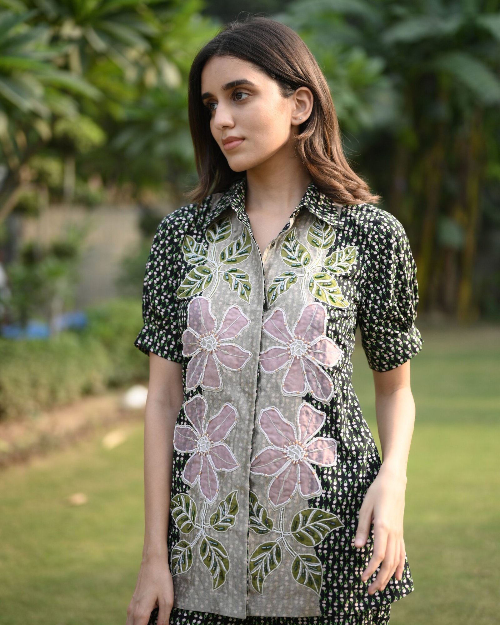 The Paradise Floral Cord Set from our Collection Attire is a graceful ensemble that blends sophistication with modern flair. Crafted from a luxurious blend of rayon and tissue fabric, it features exquisite organza and dori patchwork beautifully enhanced with hand-embellished pearls and crystals. Designed with a 28-inch shirt and 37-inch slightly boot-cut pants, this outfit offers a flattering silhouette that’s perfect for festive occasions, elegant gatherings, and evening soirees.