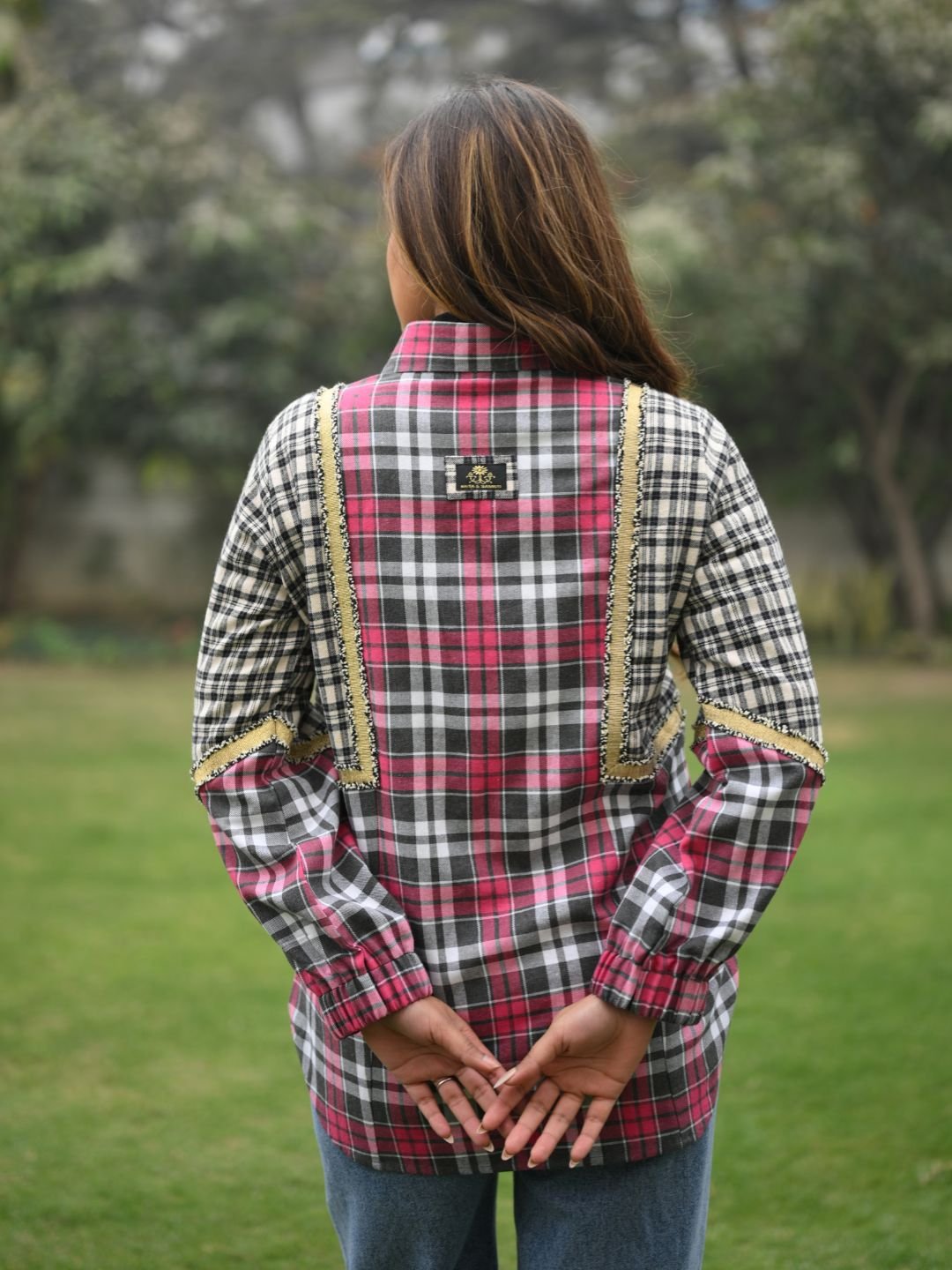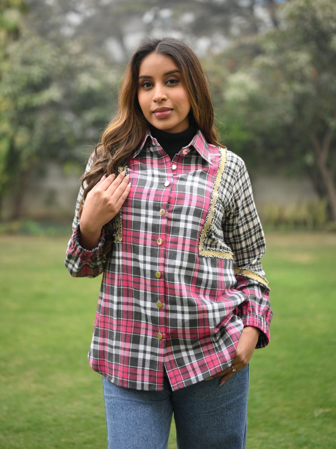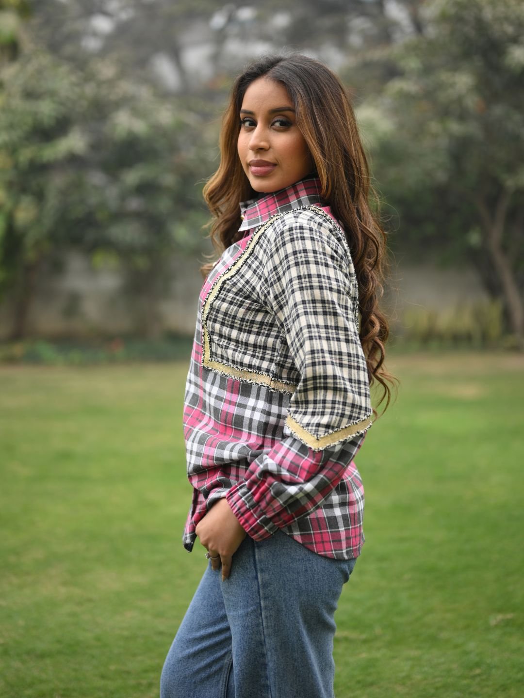 The Pinkcolada Check Shirt from the Everyday with N&S Collection blends comfort with contemporary style. Made from breathable twill cotton, it features a timeless check pattern highlighted with metallic buttons and elegant golden lace detailing. Designed for everyday wear, this shirt is ideal for casual outings and smart-casual looks with a refined edge.