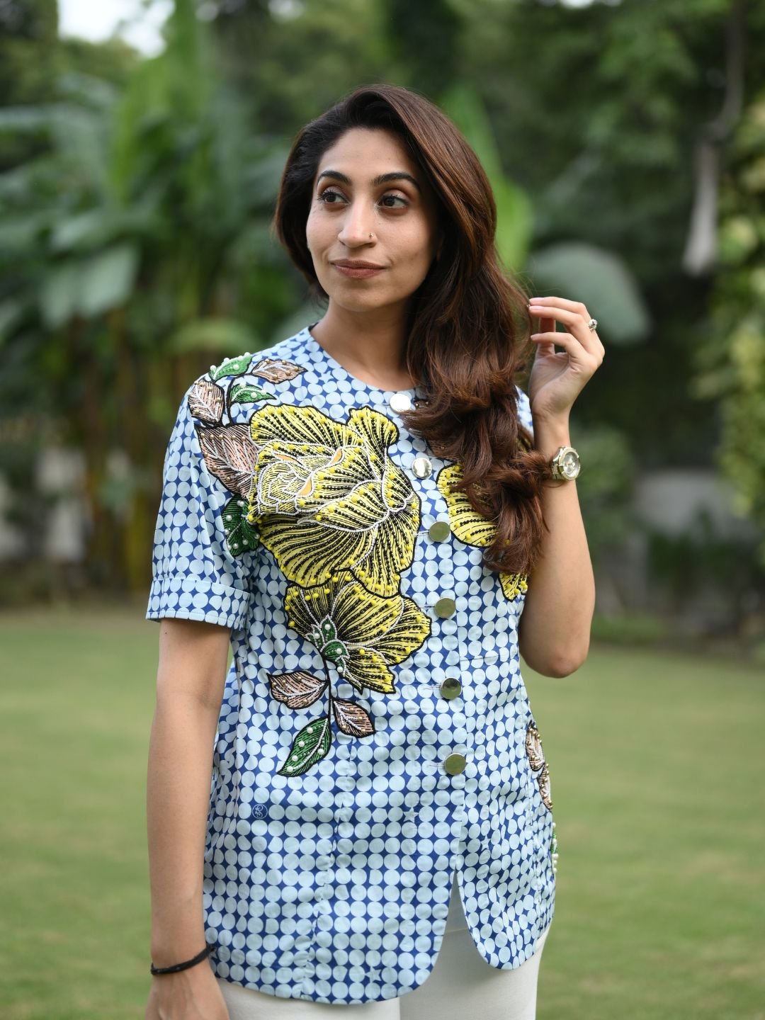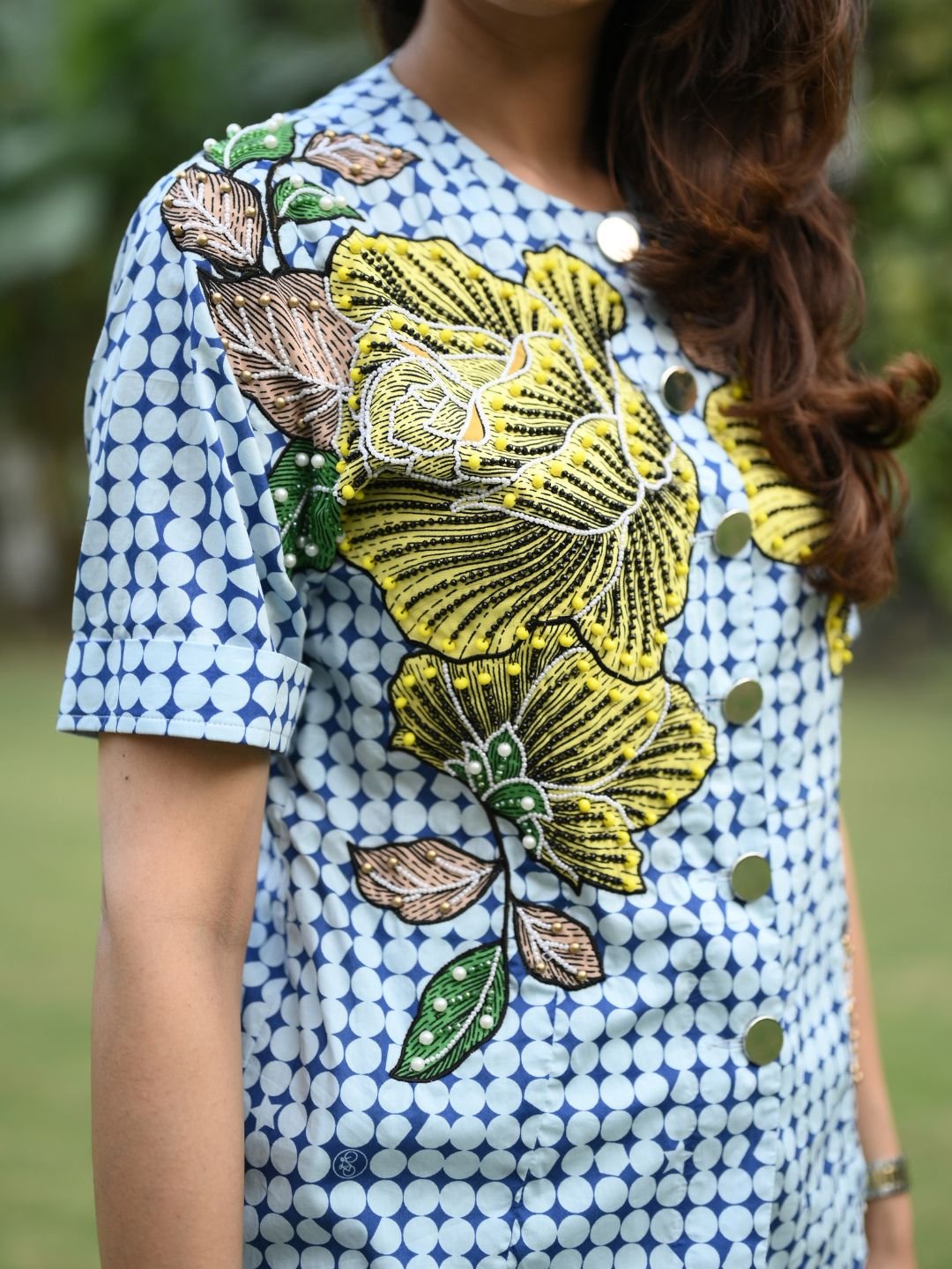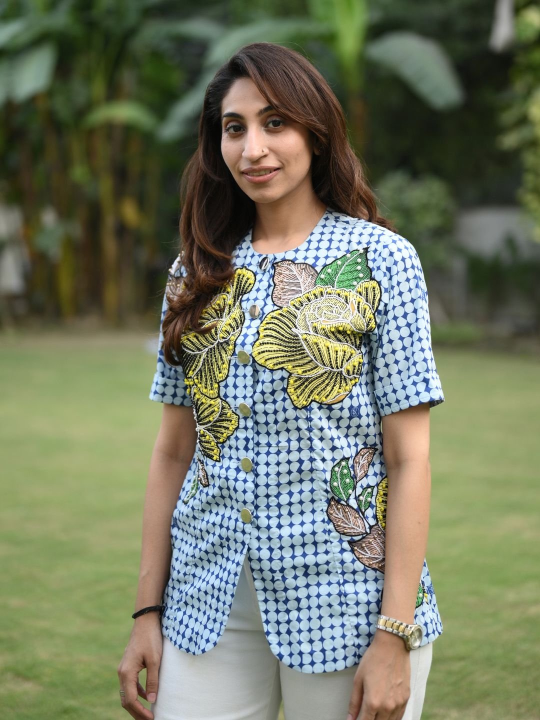 The Sunrise Shirt brings together fresh design and refined craftsmanship. Made from high-quality mercerised cotton, it features intricate appliqué work highlighted with pearl and crystal bead handwork. Designed to brighten everyday dressing, this shirt is ideal for casual outings and polished daytime looks.