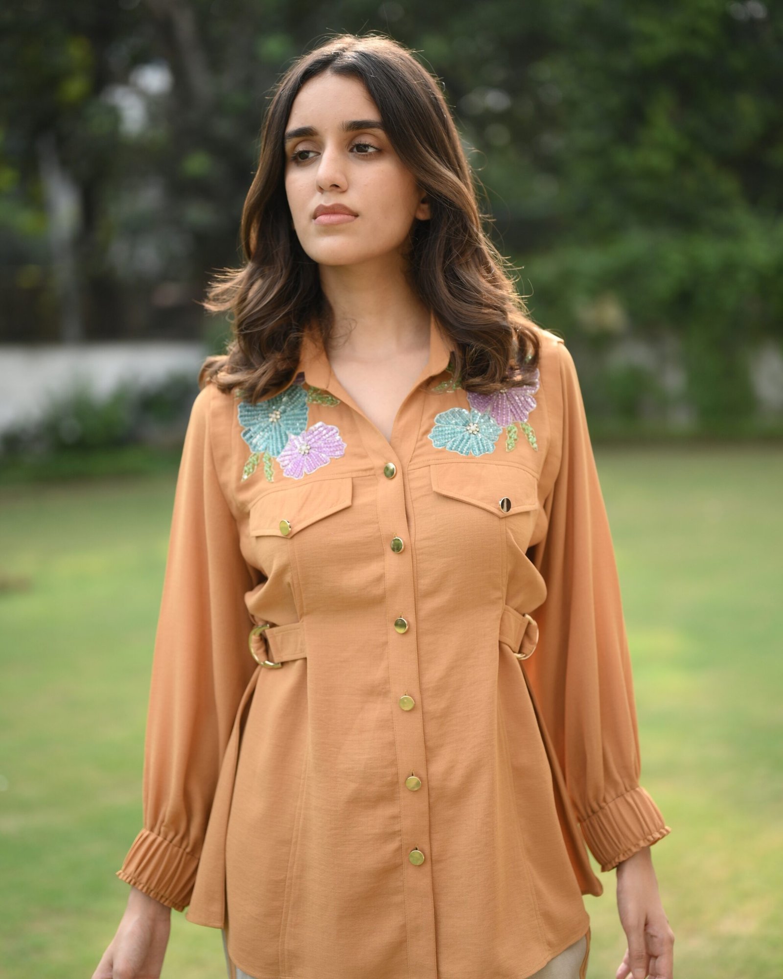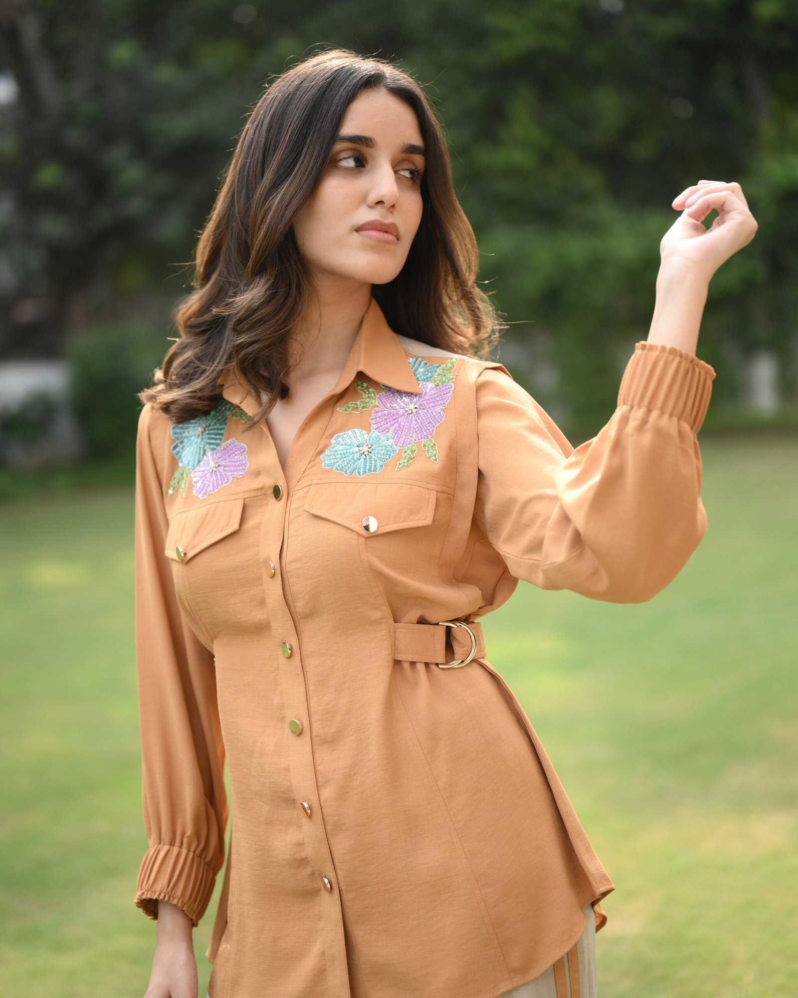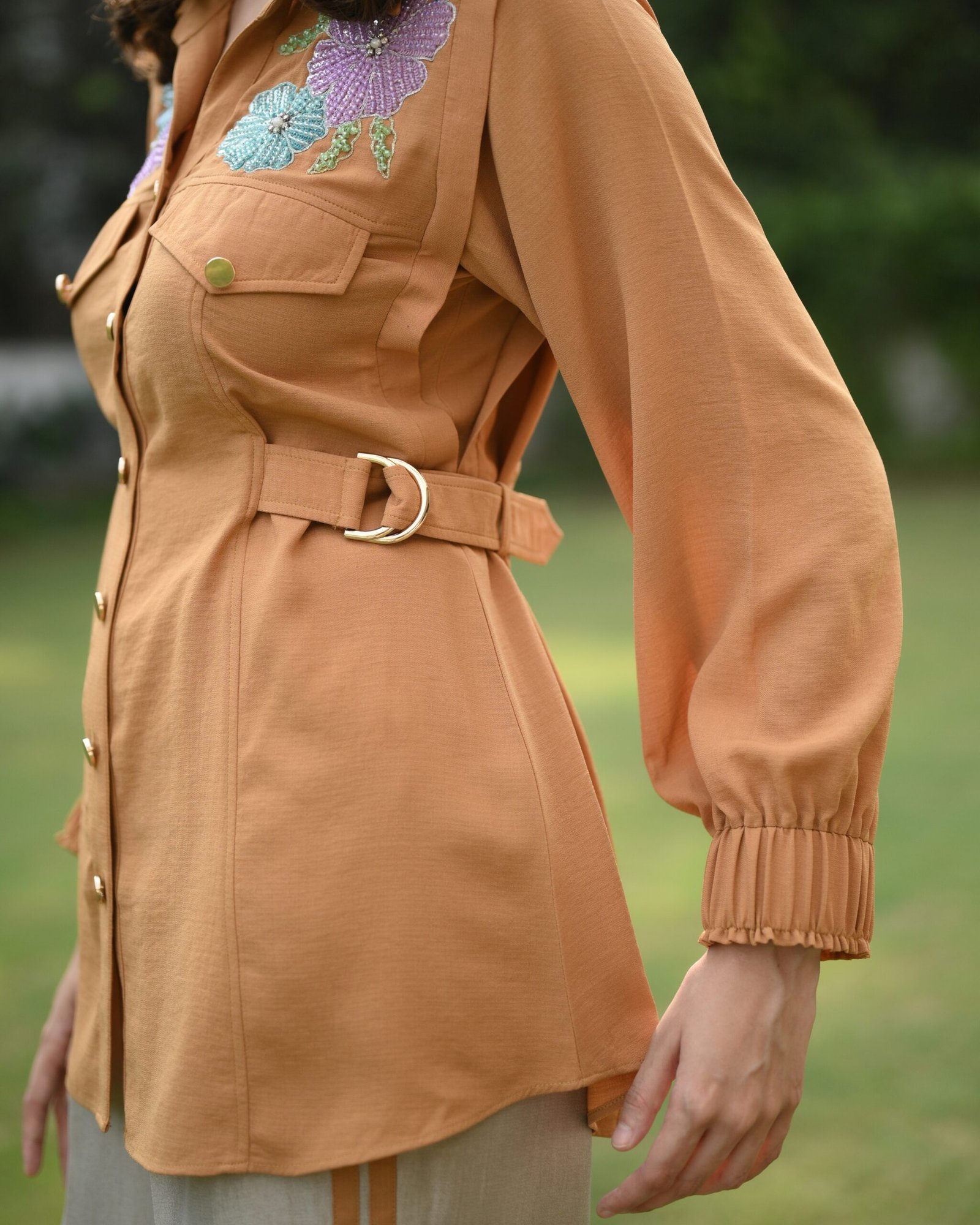The Sunset Cord Set from our Collection Attire blends traditional charm with modern style. Crafted using a premium mix of Amazon crepe and Banarasi fabric, this outfit features elegant metallic buttons and buckle detailing. The ensemble is further elevated with fine dori and sequin handwork, giving it a refined festive appeal that stands out effortlessly.