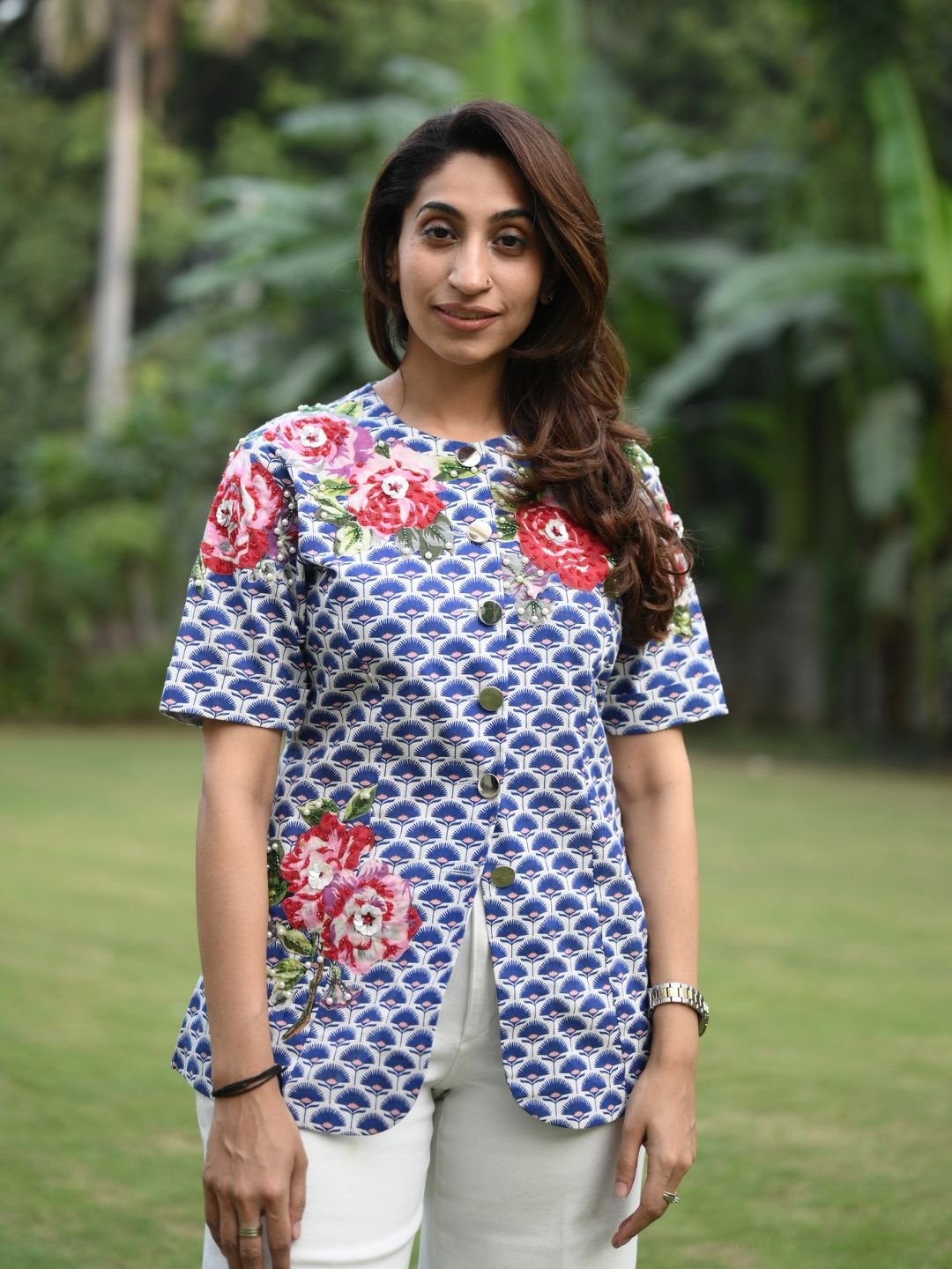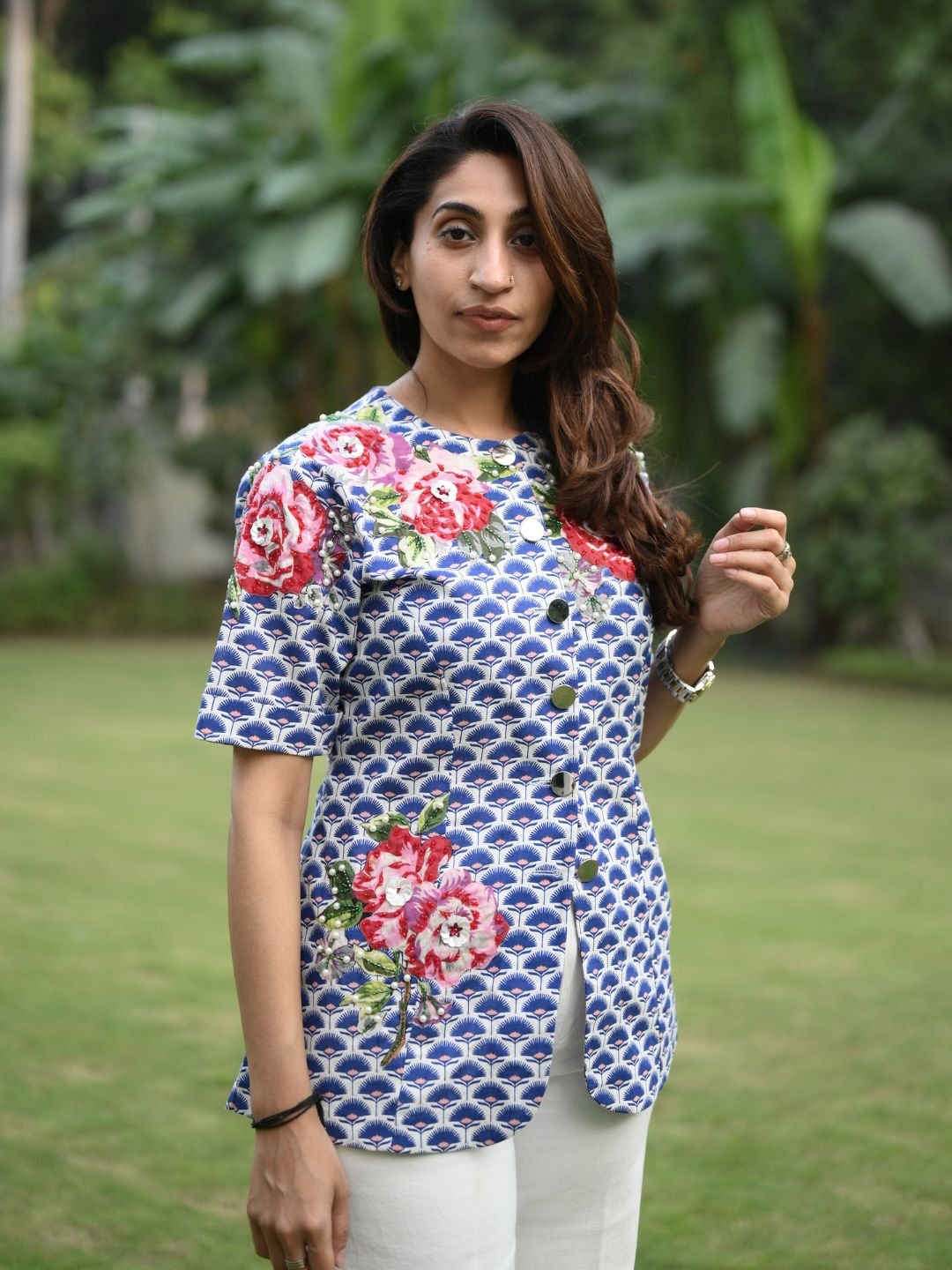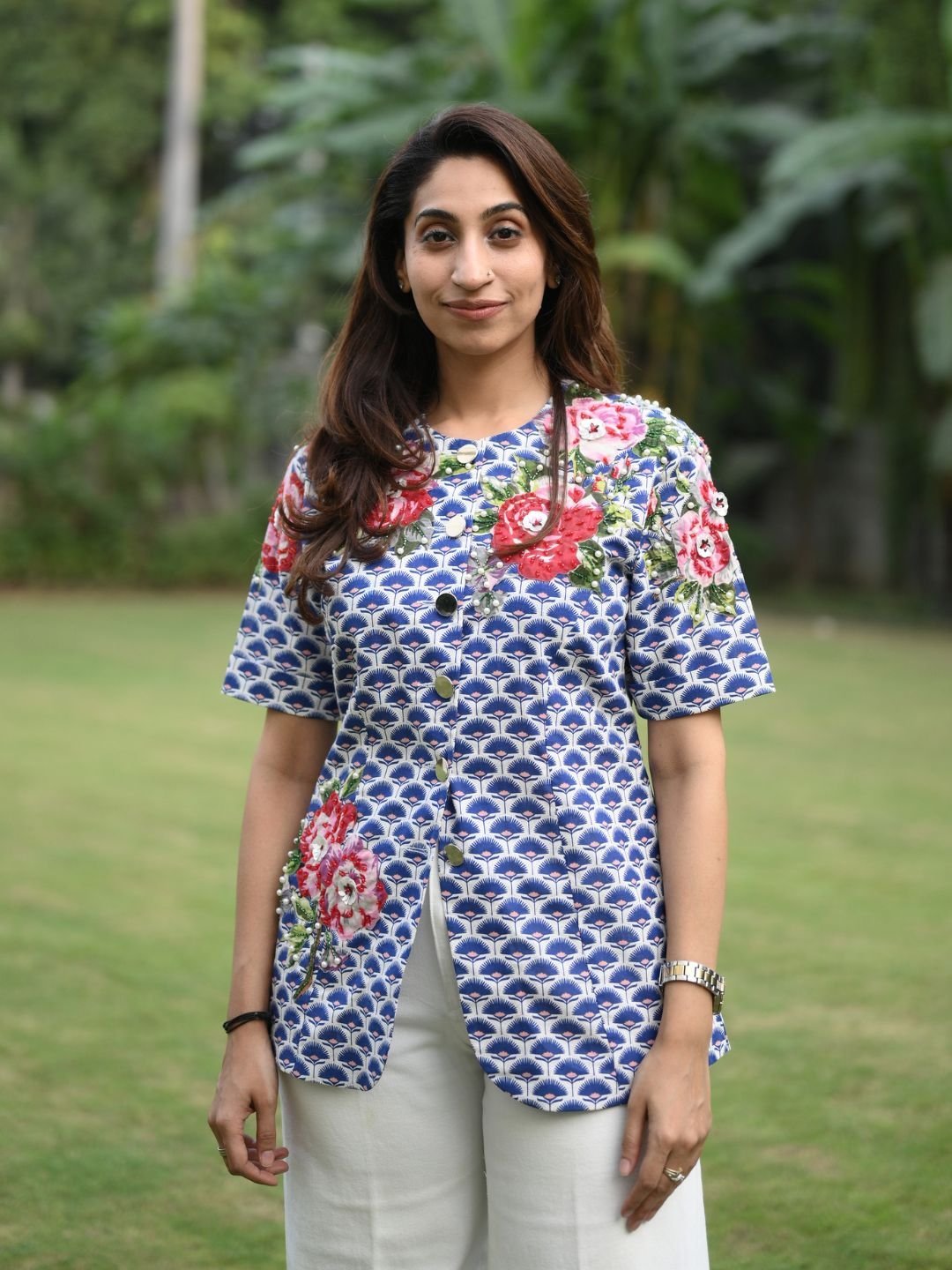 The Travellers Palm Shirt is designed for effortless comfort with artistic elegance. Made from breathable linen cotton, it showcases refined appliqué work accented with pearl and crystal bead handwork. Light, stylish, and versatile, this shirt is perfect for casual outings, travel wear, and elevated everyday looks.
