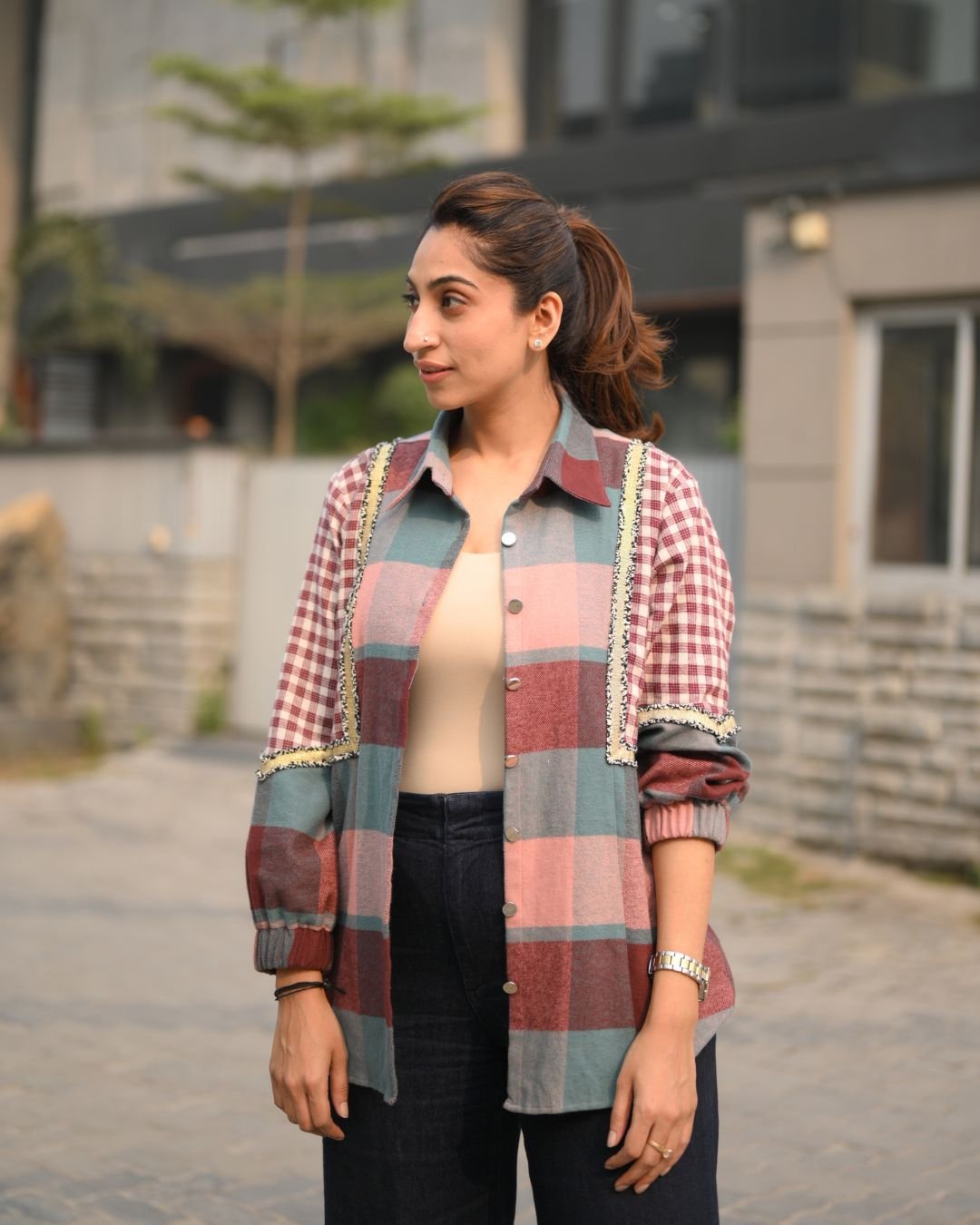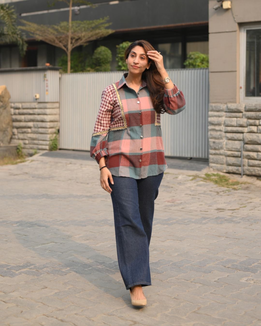 The Warm Check Shirt is crafted from premium twill cotton, offering a soft feel with a structured look. Designed with metallic buttons and enhanced with golden lace detailing, this shirt adds a refined touch to classic check patterns. Perfect for stylish everyday wear, it blends comfort, warmth, and contemporary design effortlessly.