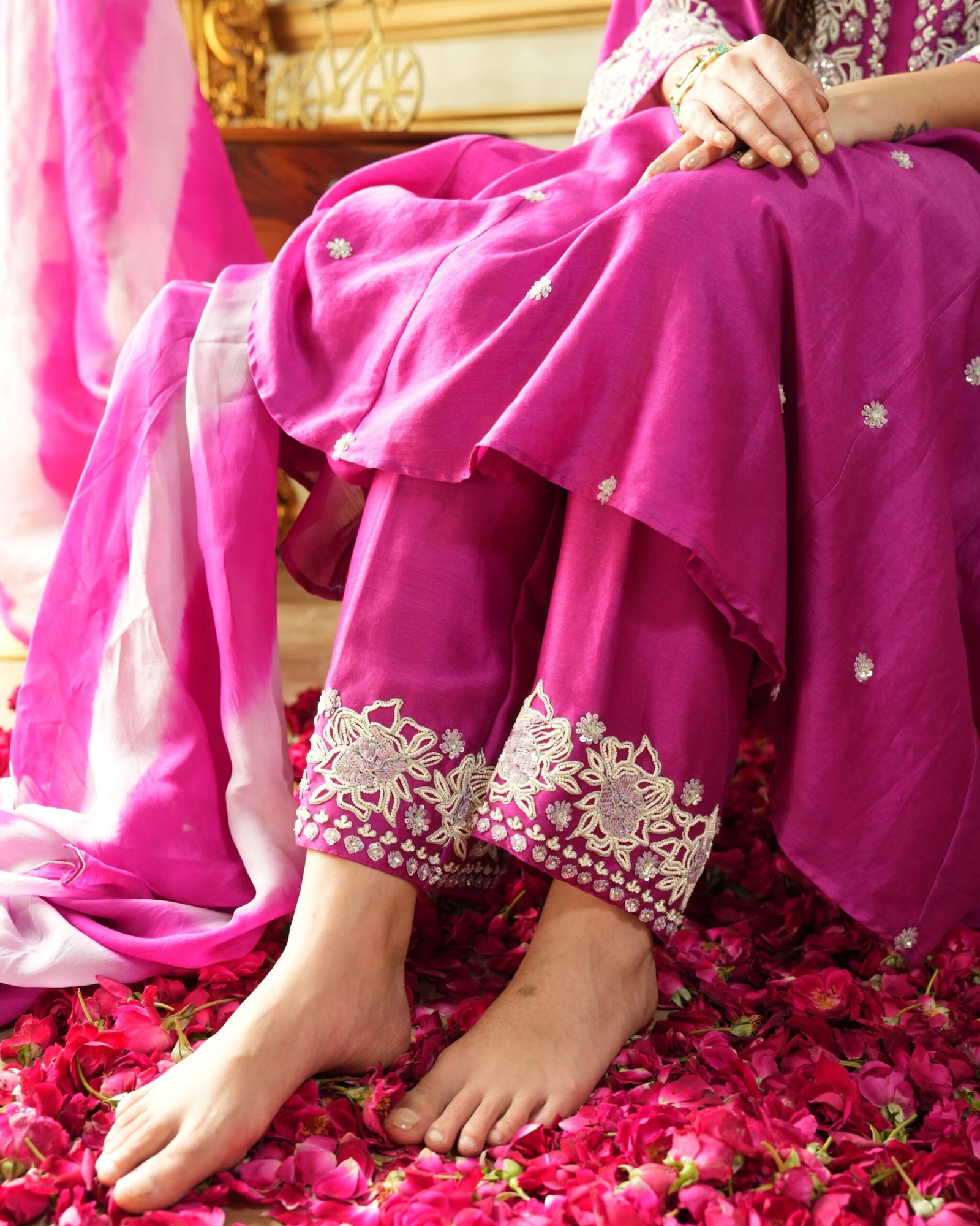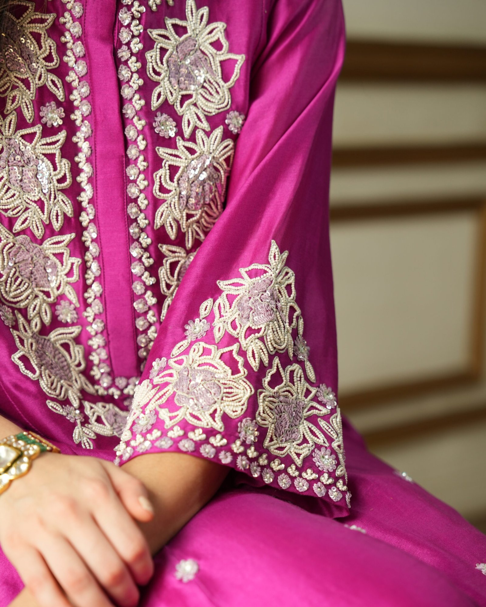 The Zariya Gulnaar Suit Set is crafted in luxurious silk chanderi and features a rich magenta kurta adorned with intricate embroidery, delicate dori work, and pearl hand detailing. Paired with embroidered pants and a complementing dupatta, it’s the perfect choice for festive occasions and family gatherings.
